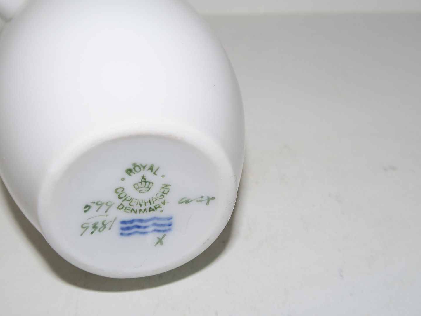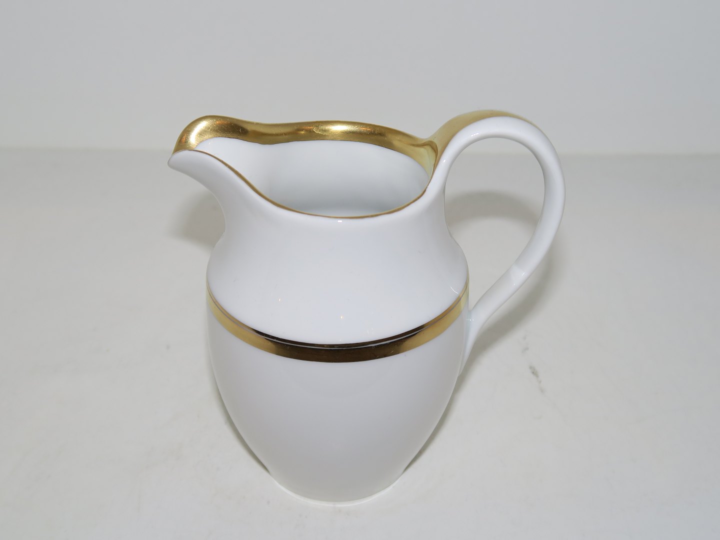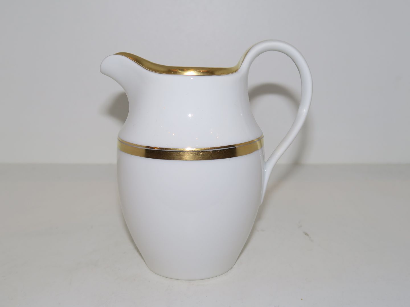 Royal Copenhagen Hvidt med bred guldkant, flødekande. Fabriksmærket viser, at denne er produceret i 1960. Dekorationsnummer 599/9381. 2. sortering. Højde 11,2 cm. Perfekt stand uden fejl.