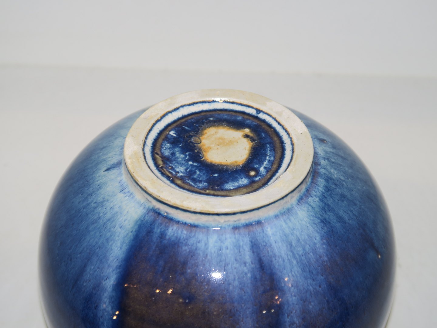 Unknown art pottery, bowl with blue glaze in modern shape.