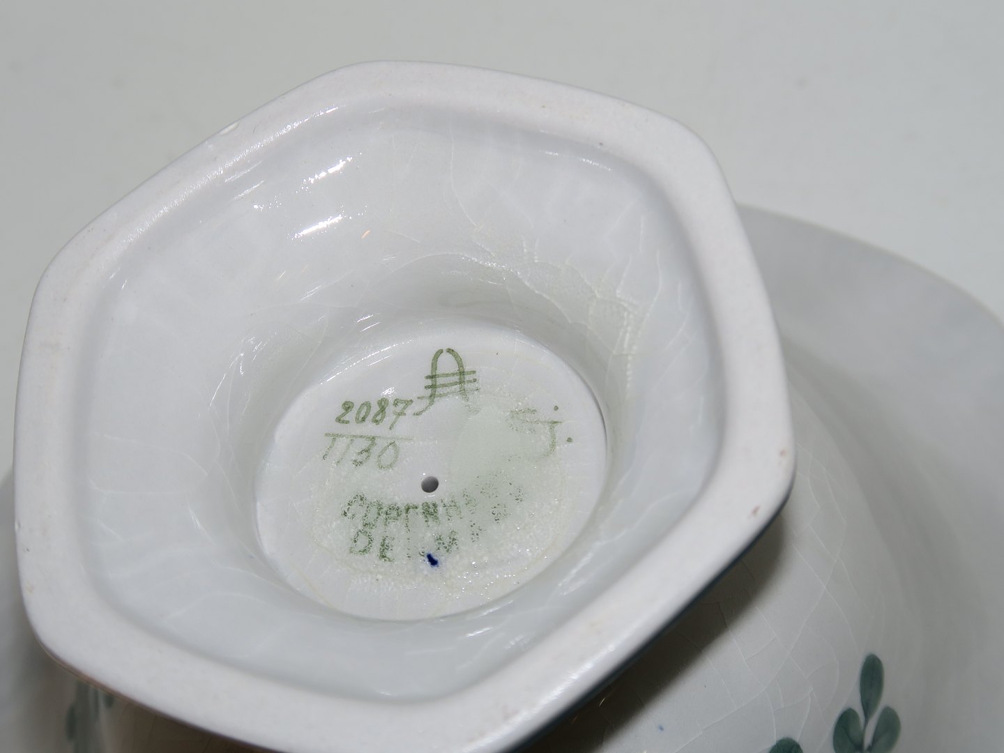 Aluminia green Tranquebar, rare bowl on stand. Decoration number 2087/1130. Factory first. Height 12.0 cm., diameter 21.5 cm. Has some crazing in glaze small chip underneath the top rim otherwise perfect condition.