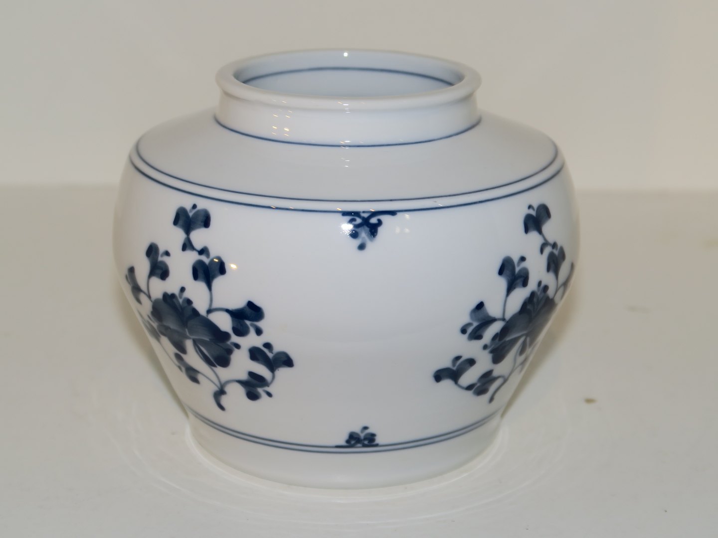 Bing & Grøndahl, grålig rund vase med blå blomster.