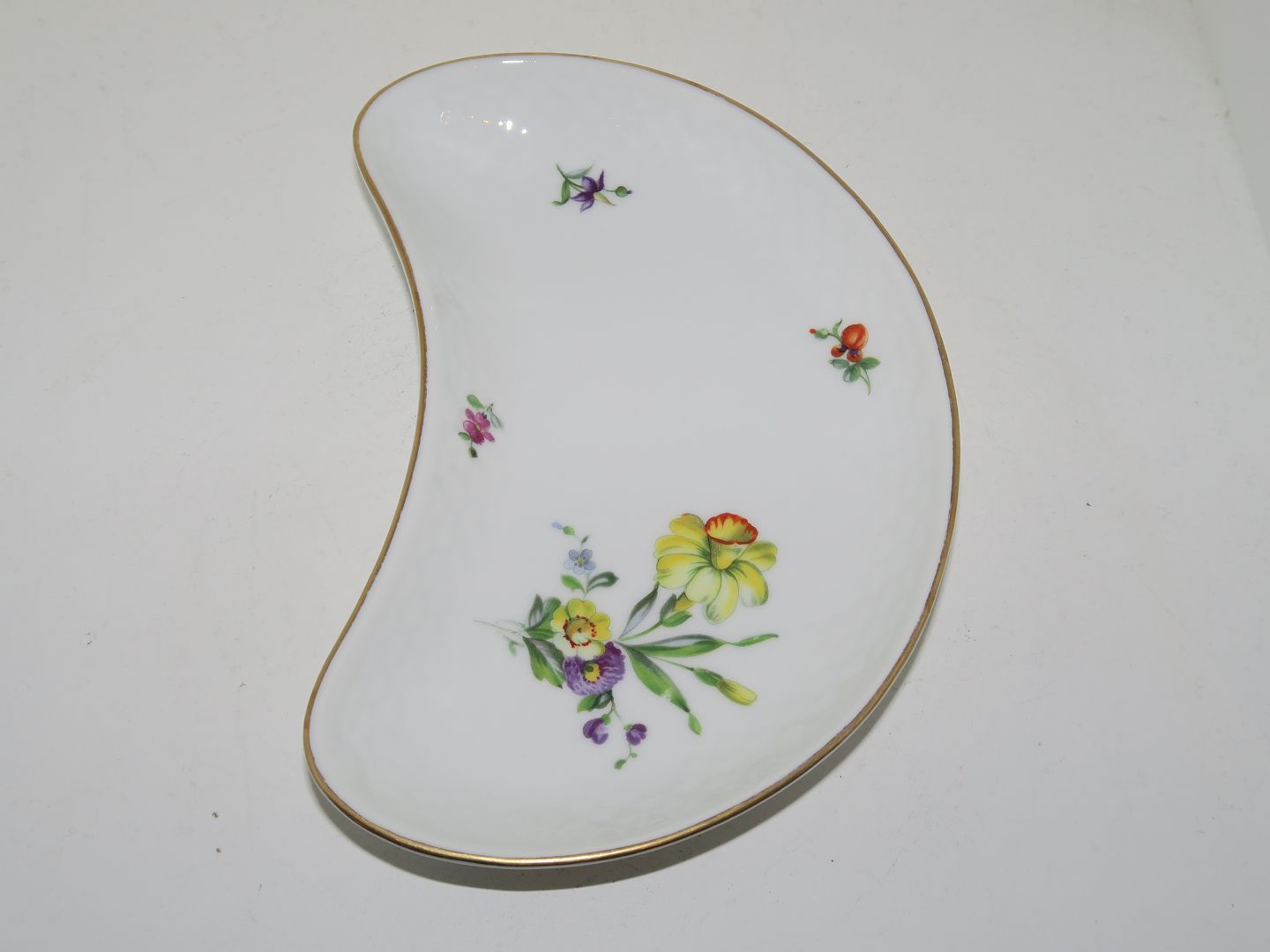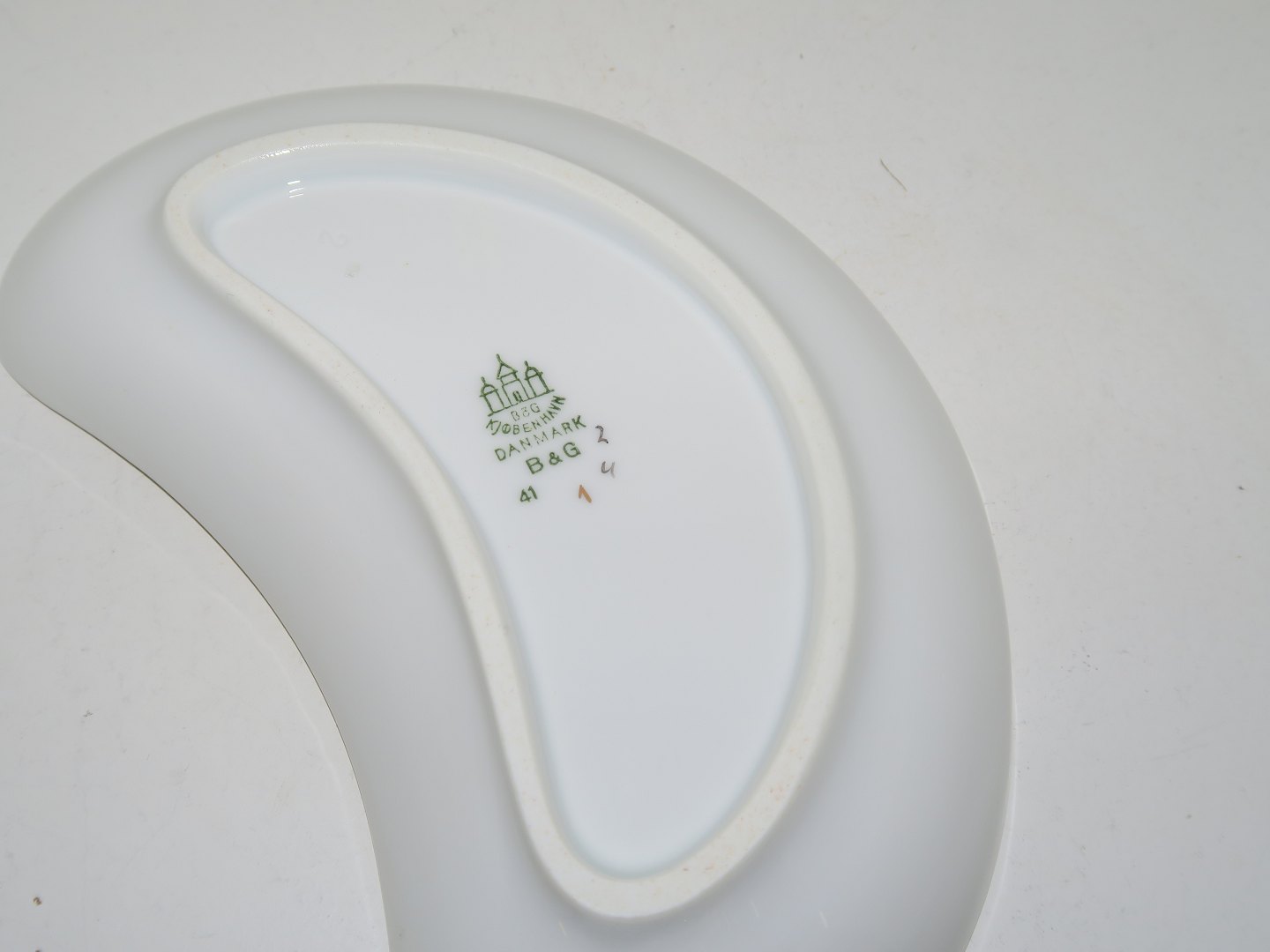 Bing & Grøndahl Saksisk Blomst på hvidt porcelæn, måneformet asiet. Dekorationsnummer 41. 1. sortering. Længde 19,5 cm. Perfekt stand uden fejl.