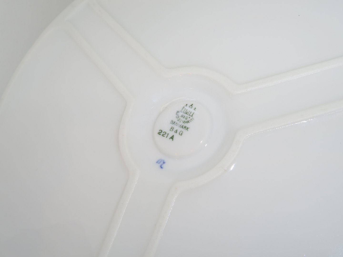 Bing & Grøndahl Empire, tre-delt rundt fad med knob. Fabriksmærket viser, at denne er fra mellem 1962 og 1970. Dekorationsnummer 221A. 2. sortering. Diameter 23,0 cm. Perfekt stand uden fejl.