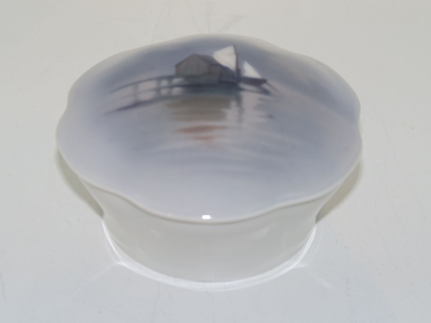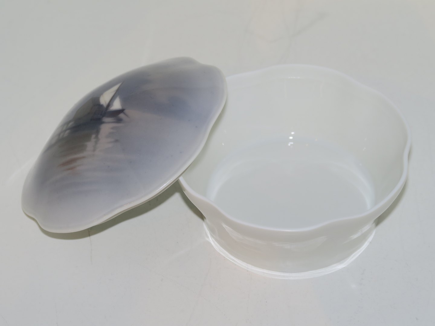 Bing & Grøndahl, Art Nouveau skål med låg med sejlbåd.