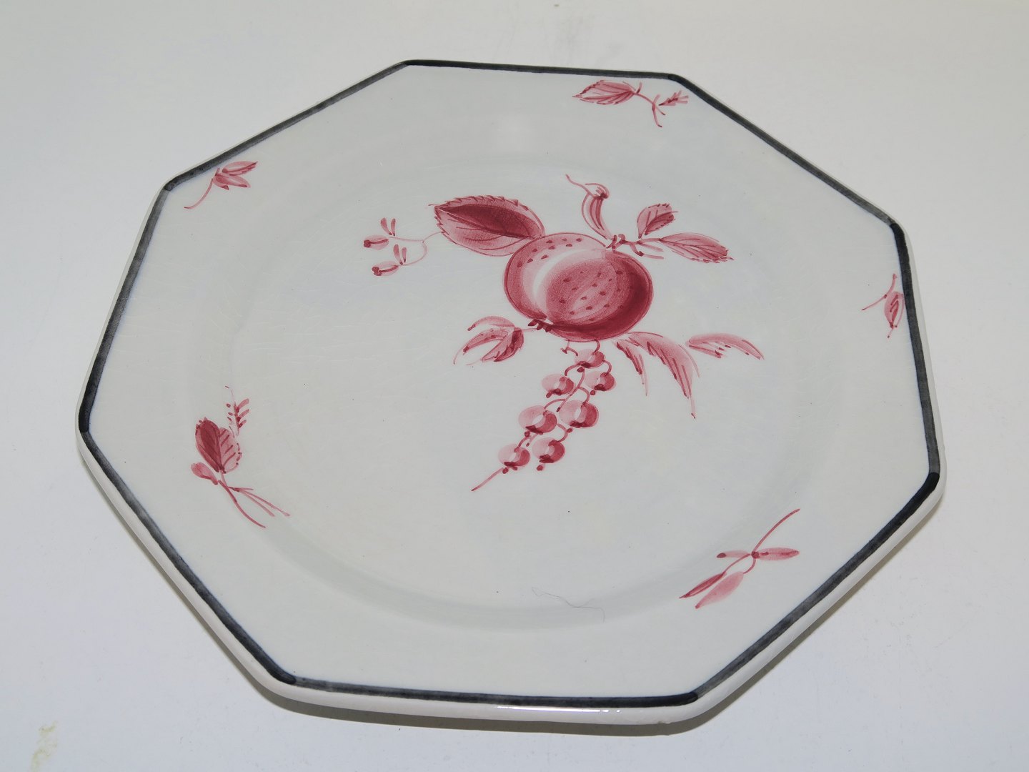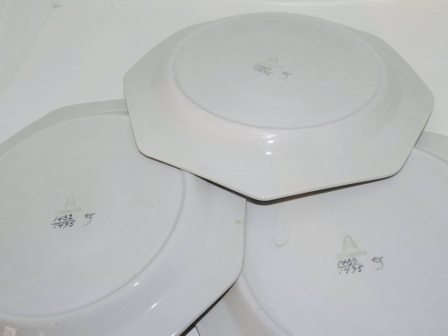 Aluminia fruit service, octagonal plate with red decoration. Decoration number 1482/1495, 1483/1495 and 1484/1495. Factory first. Measures 20.0 cm. There are crazings in glaze otherwise perfect condition.