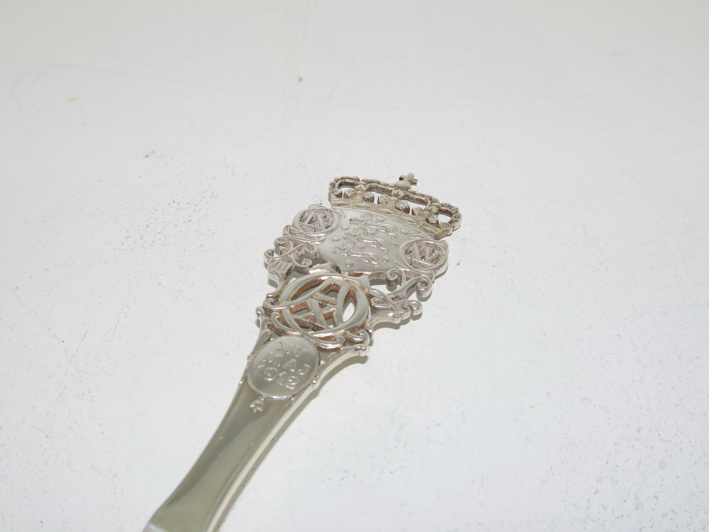 Anton Michelsen guilded sterling silver, commemorative spoon from 1912. The crowning of King Christian X on May 15th. 1912. Designed by Hans Tegner. Length 15.5 cm. Excellent condition.