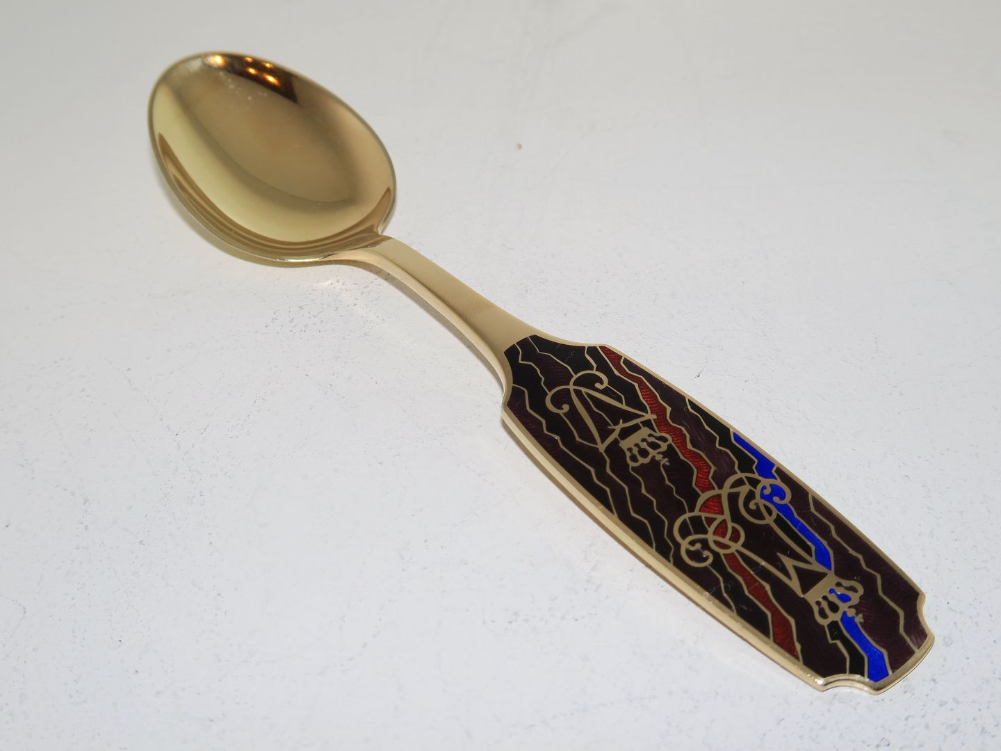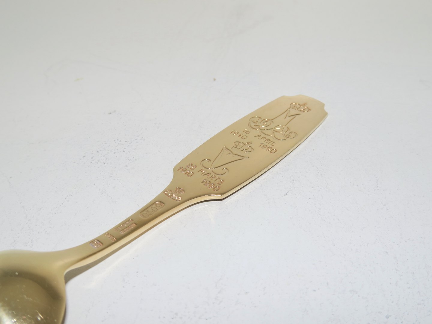 Peter Hertz forgyldt sterlingsølv, mindeske fra 1990. Dronningeskeen: Dronning Margrethe 16. april 1940-1990. Dronning Ingrid 28. marts 1910-1990. Længde 16,3 cm. Perfekt stand.