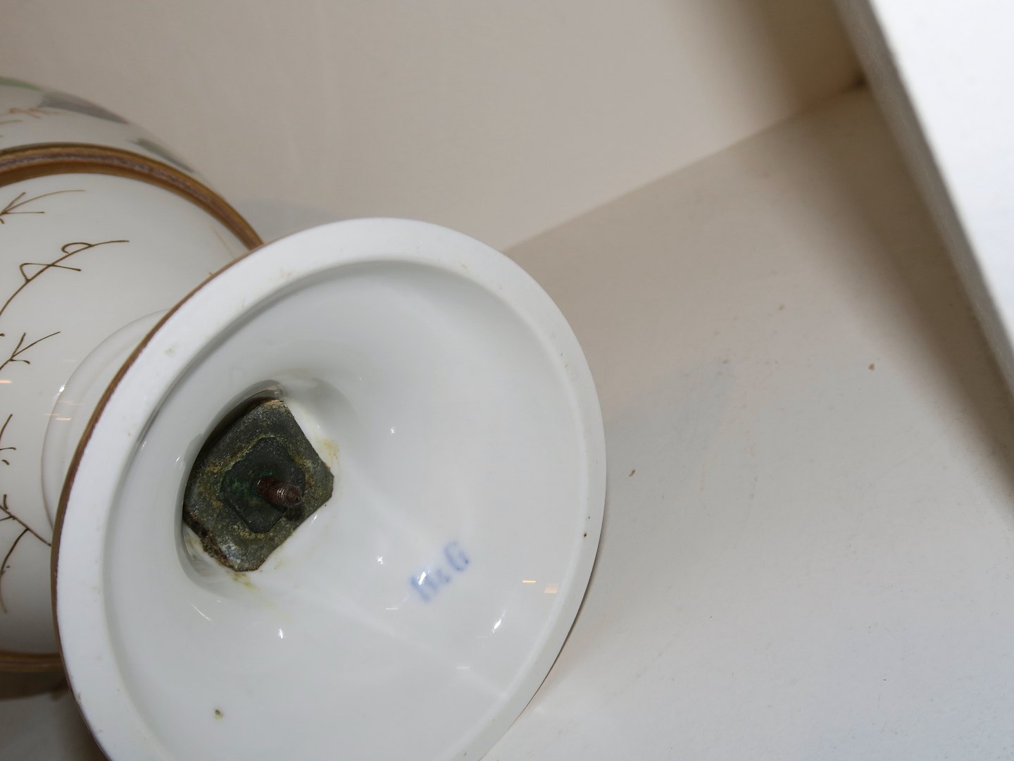 Bing & Grøndahl høj pragtvase med guldhåndtag og dekoreret med fugle på begge sider.