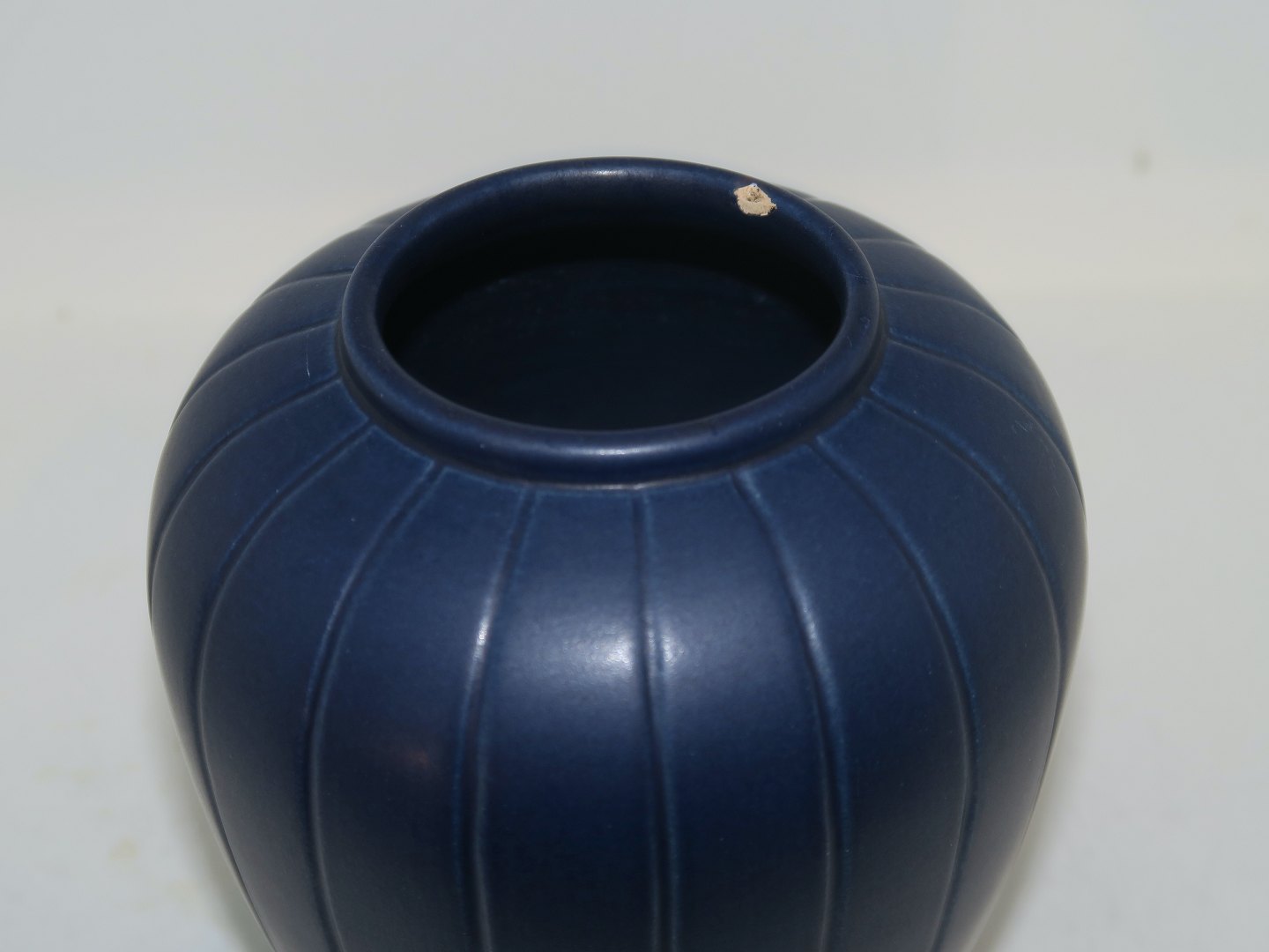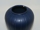 Ipsen keramik, mørkeblå vase med riller. Dekorationsnummer 60. Designet af Axel Sørensen. Højde 12,5 cm. Der er et skår i toppen samt lidt små afslag på ståkanten ellers fin stand.