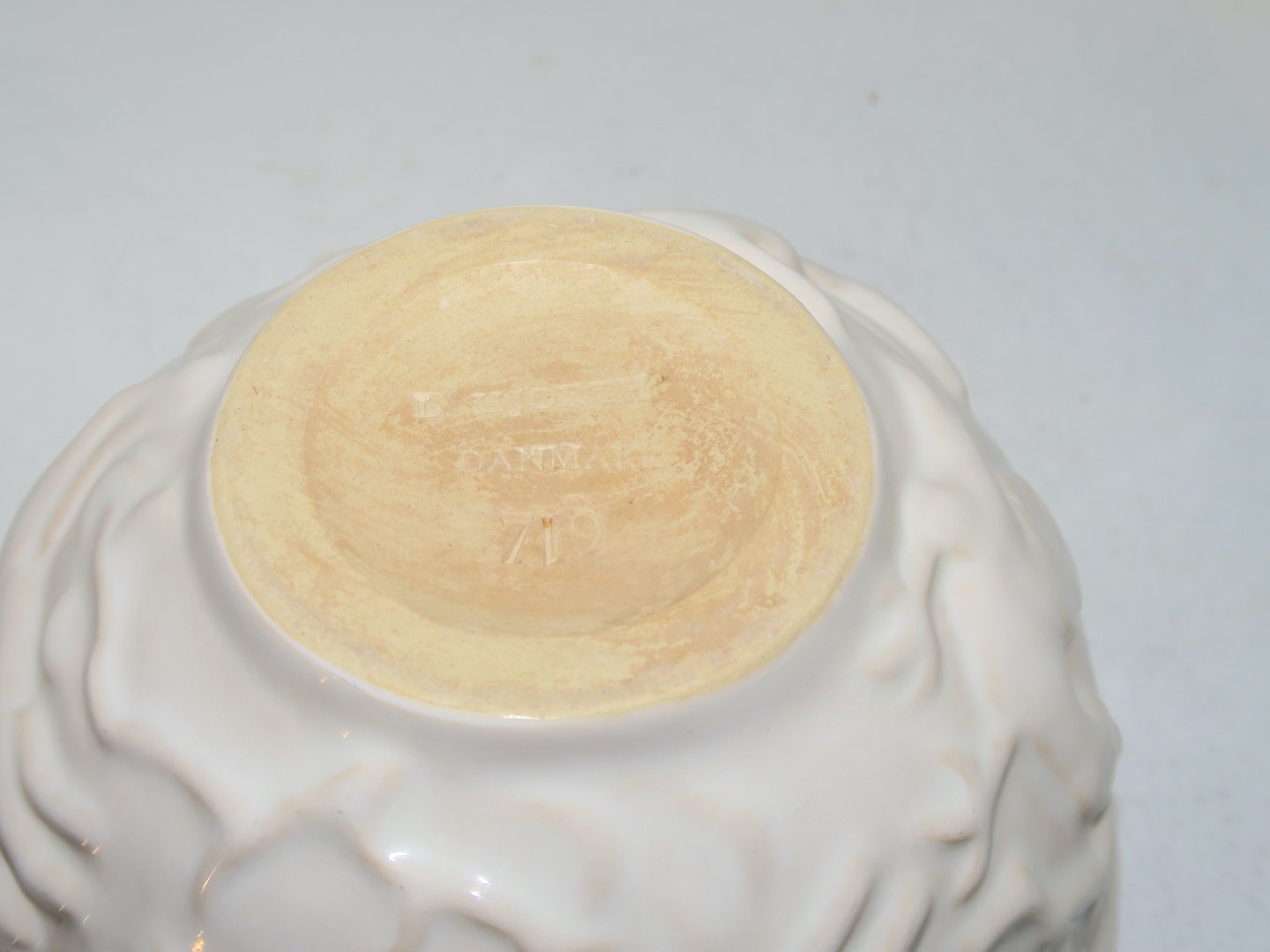 Hjorth art pottery from the island Bornholm, white jar with birds and rabbits.