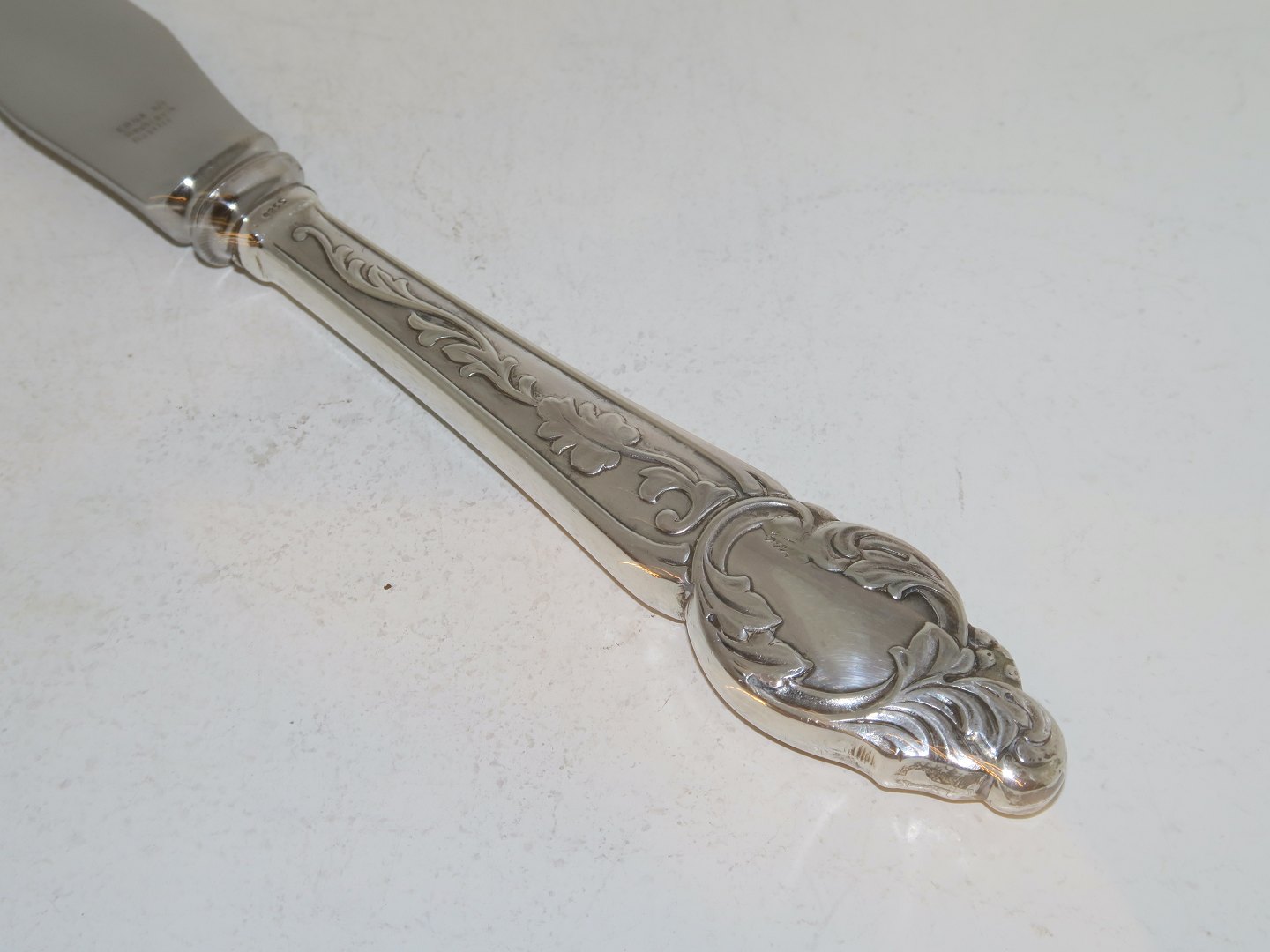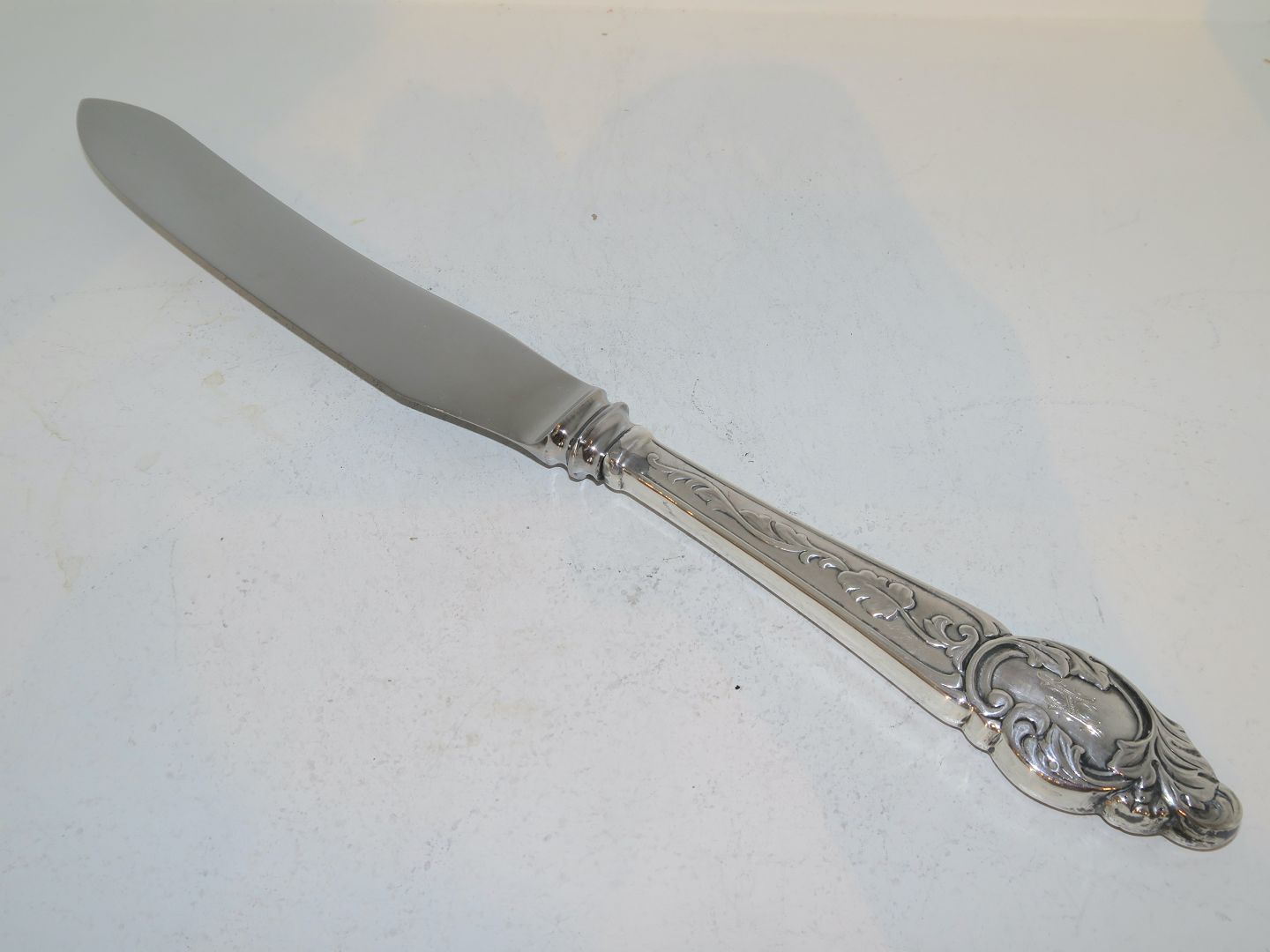 Sterling silver and stainless steel, cake knife. Length 29.2 cm. There is an engraving on one side, otherwise excellent but used condition.