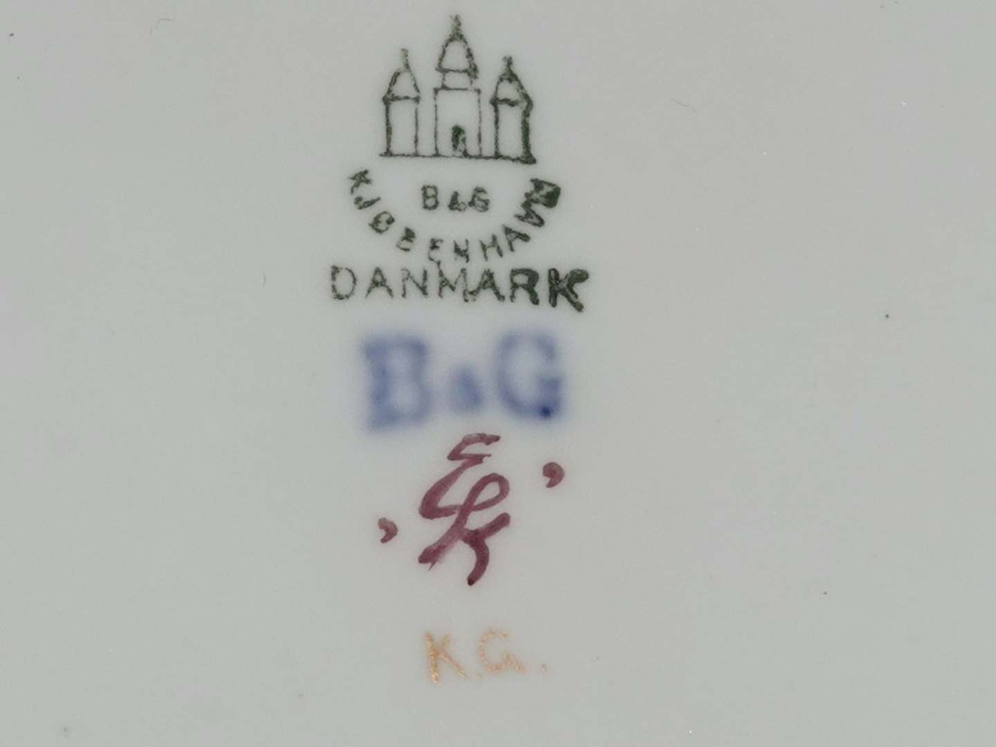 Signed "EK". In 1896 Emma Kongsbøll was hired at age 16 by Bing & Grondahl. In 1907 was Hans Tegner appointed as artistic director and Emma was a student to him. When Hans Tegner passed away in 1932 became Emma Kongsboll the new artistic leader at Bing & Grondahl.