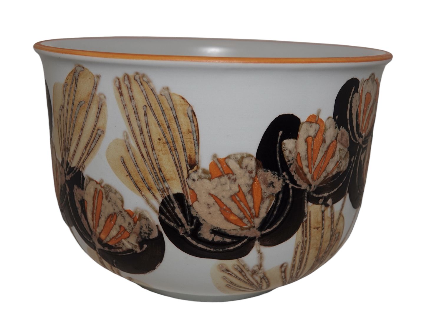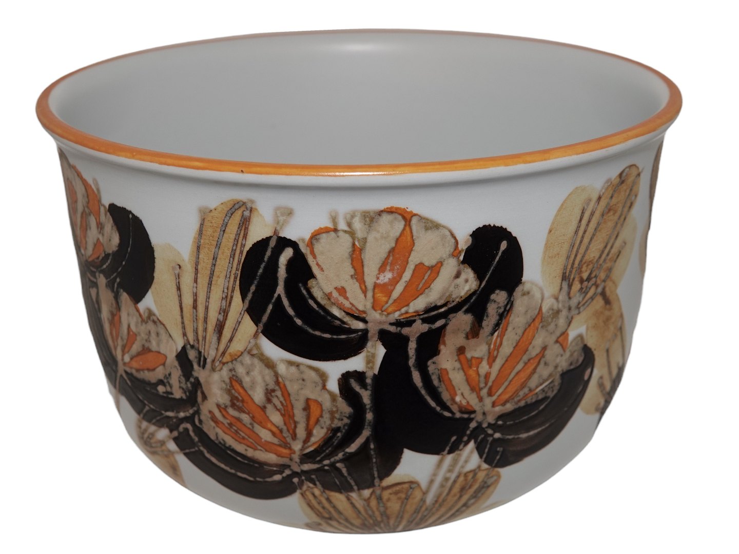 Royal Copenhagen Siena, urtepotteskjuler. Designet og signeret af Ellen Malmer. Dekorationsnummer 962/3757. 2. sortering. Diameter 18,5 cm., højde 12,8 cm. Perfekt stand uden fejl.