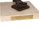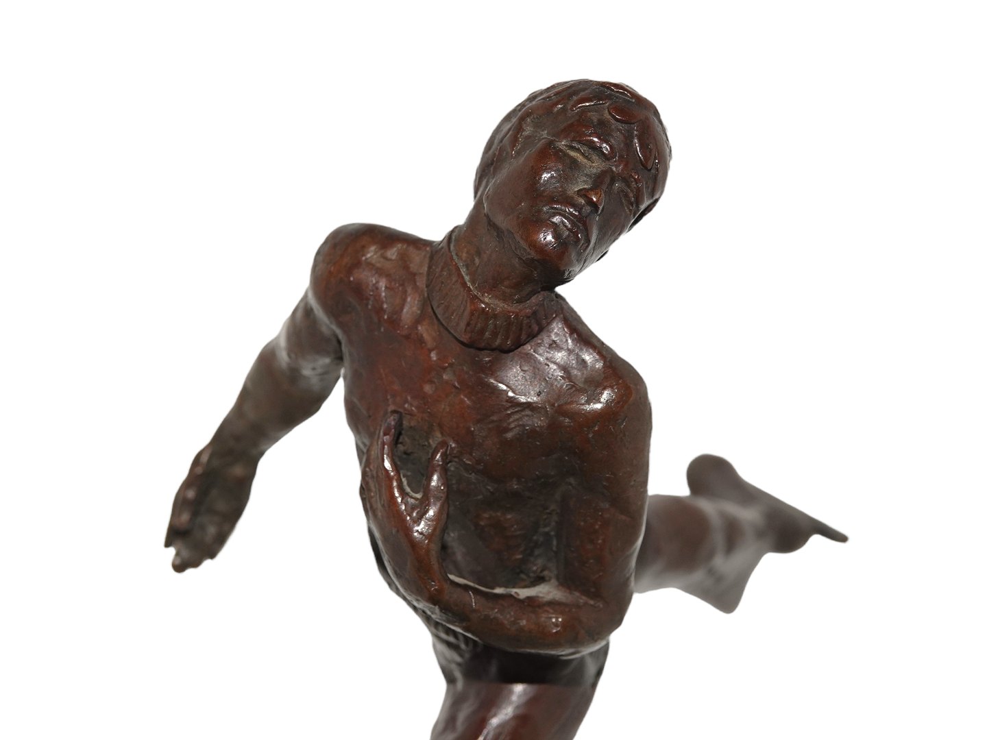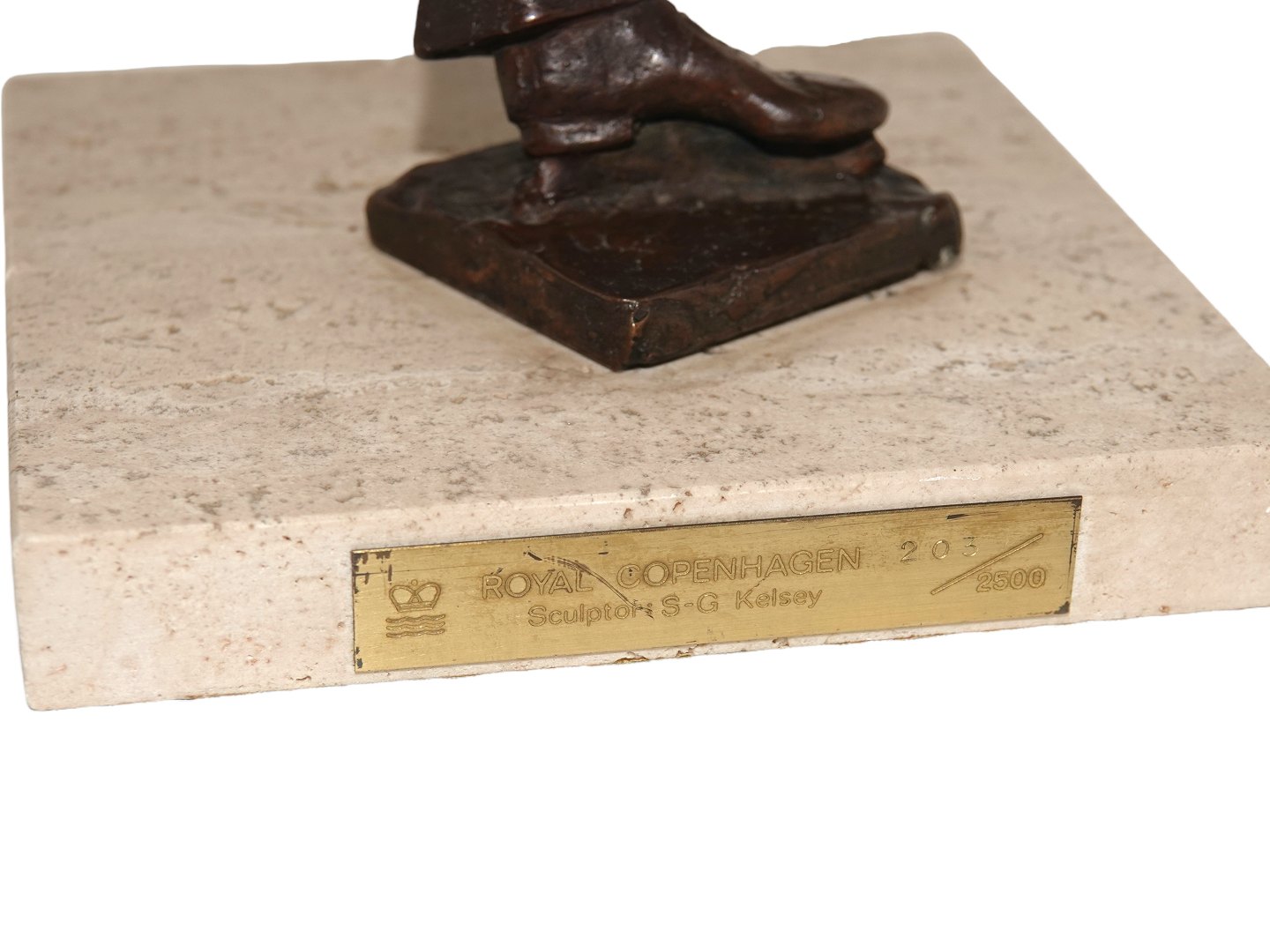 Royal Copenhagen bronzefigur af skøjteløber på marmorsokkel. Designet af Designet af Sterett-Gittings Kelsey. Med messingplakette nummereret 203/2500. Længde 20,0 cm., højde 22,5 cm. Fejlfri stand med fin patina.