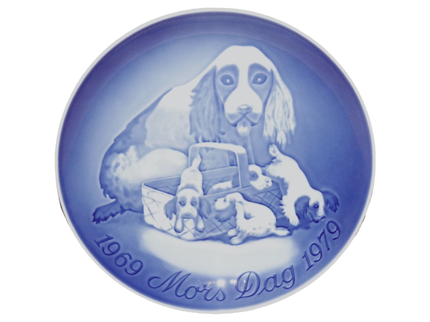 Stor Bing & Grøndahl Mors Dag 5 Års jubilæumsplatte fra 1979, cockerspaniel med hvalpe.