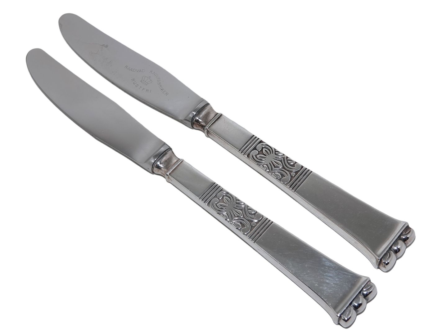 Rigsmønster sølv fra Frigast middagskniv. Tretårnet sølv. Længde 21,7 cm., heraf måler knivbladet 10,0 cm, Pæn men brugt stand uden buler/indgraveringer/ridser.