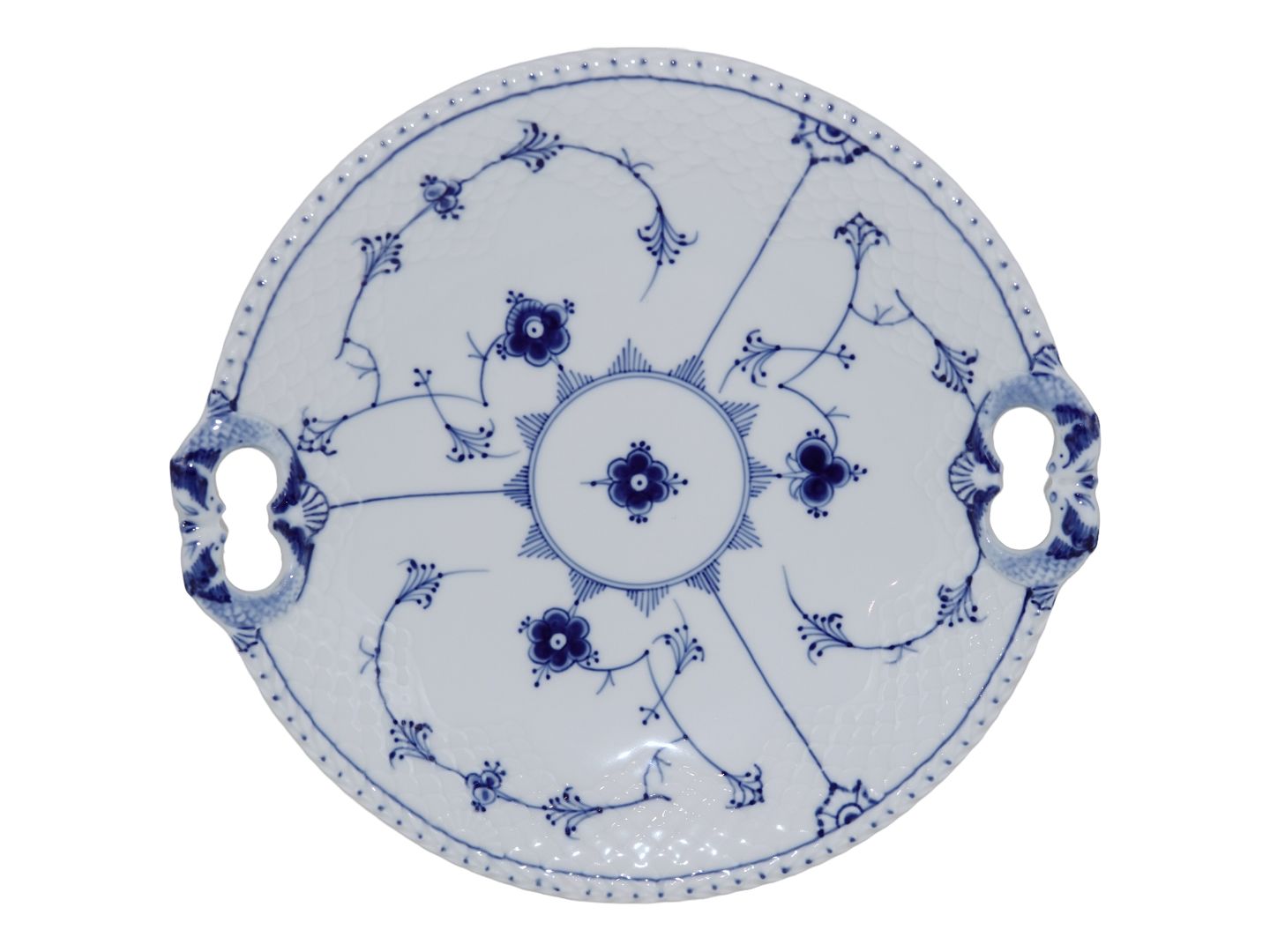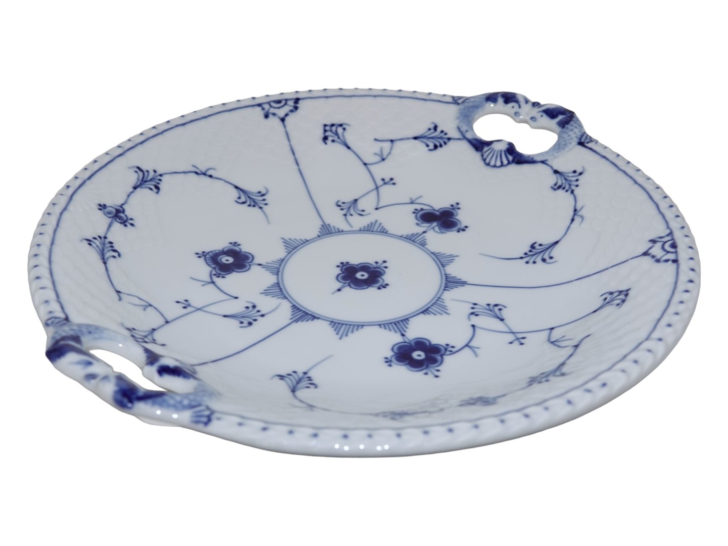 Bing & Grondahl Blue Fluted "Blue Traditional", large cake dish. The factory mark shows, that this was produced between 1970 and 1983. Factory second. Length 26.7 cm. Perfect condition with no chips, cracks or repairs.