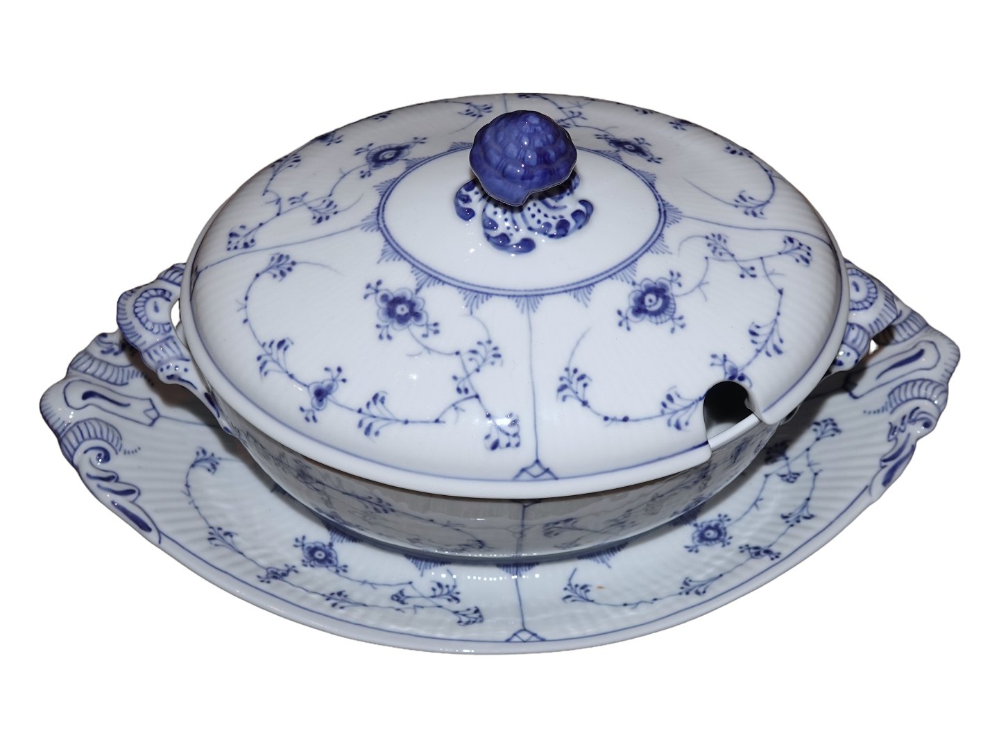 Royal Copenhagen Musselmalet Riflet, oval suppeterrin med tilhørende underfad.
