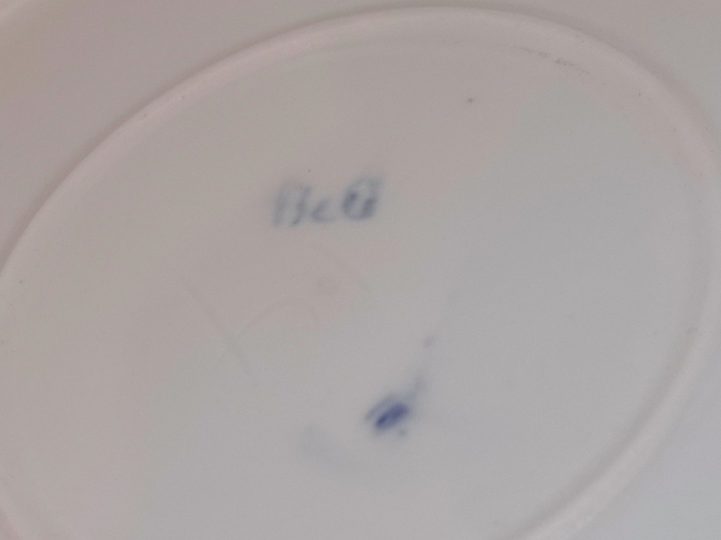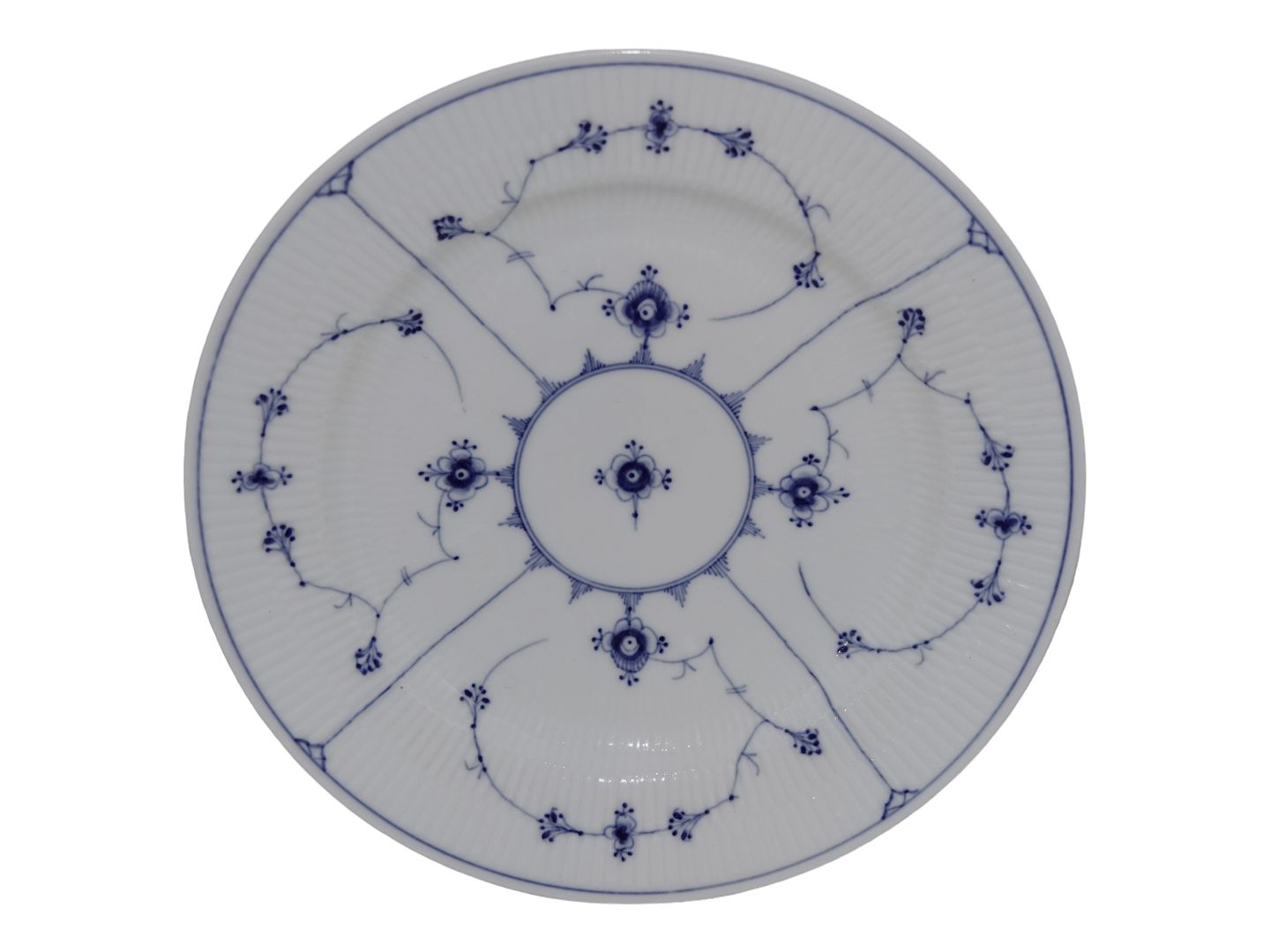 Bing & Grøndahl Blåmalet Riflet (Musselmalet Riflet), lille rundt fad. Af fabriksmærket ses det, at denne er produceret mellem 1853 og 1895. 1. sortering. Diameter 27,5 cm. Perfekt stand uden fejl.