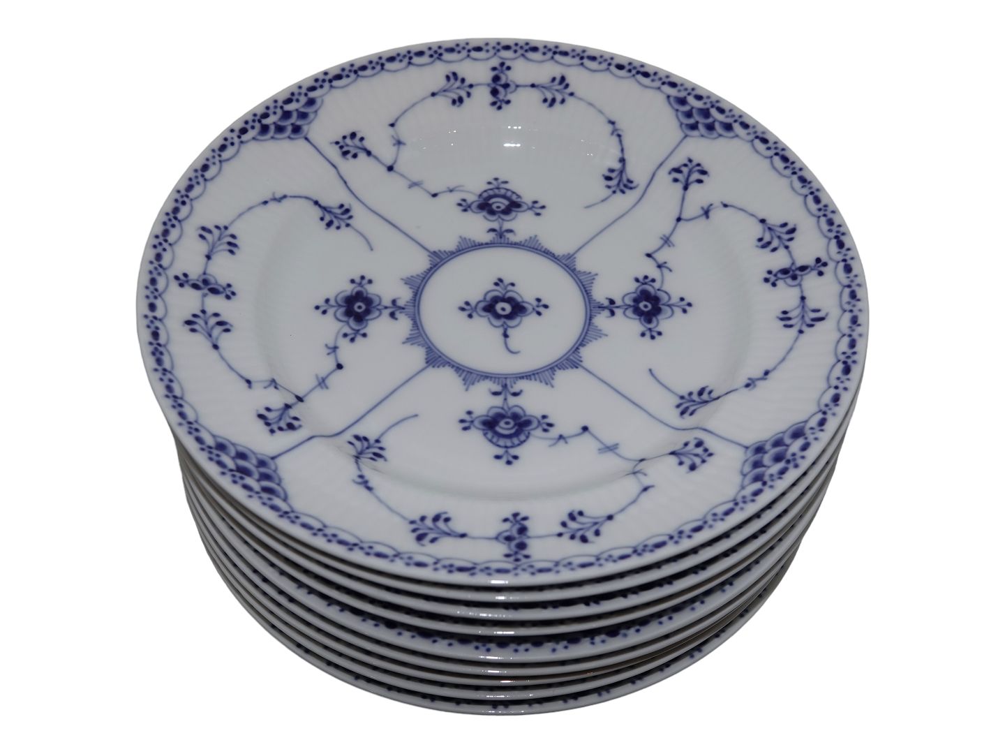Royal Copenhagen Musselmalet Halvblonde, frokosttallerken. Dekorationsnummer 1/572. 1. sortering men har lidt encellet i glasuren. Diameter 22,5 cm. Perfekt stand uden fejl.