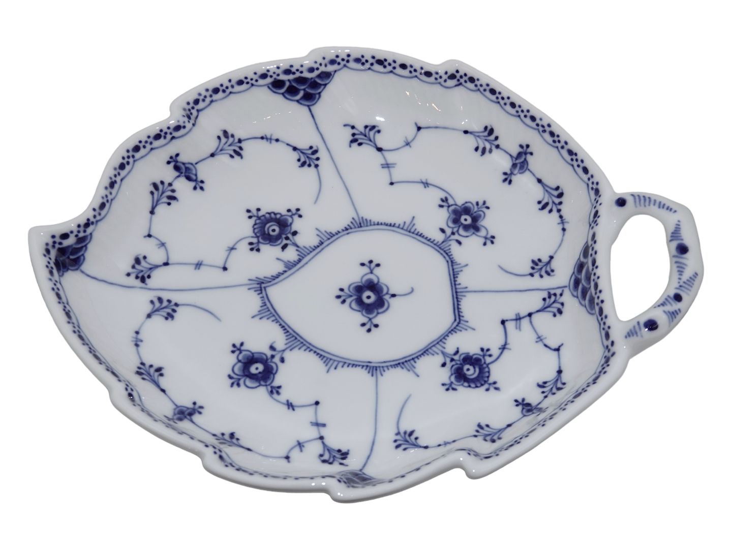 Royal Copenhagen Musselmalet Halvblonde, kagefad i stor størrelse. Dekorationsnummer 1/549. Disse er produceret mellem 1923 og 1928. 2. sortering. Længde 26,5 cm. Perfekt stand uden fejl.