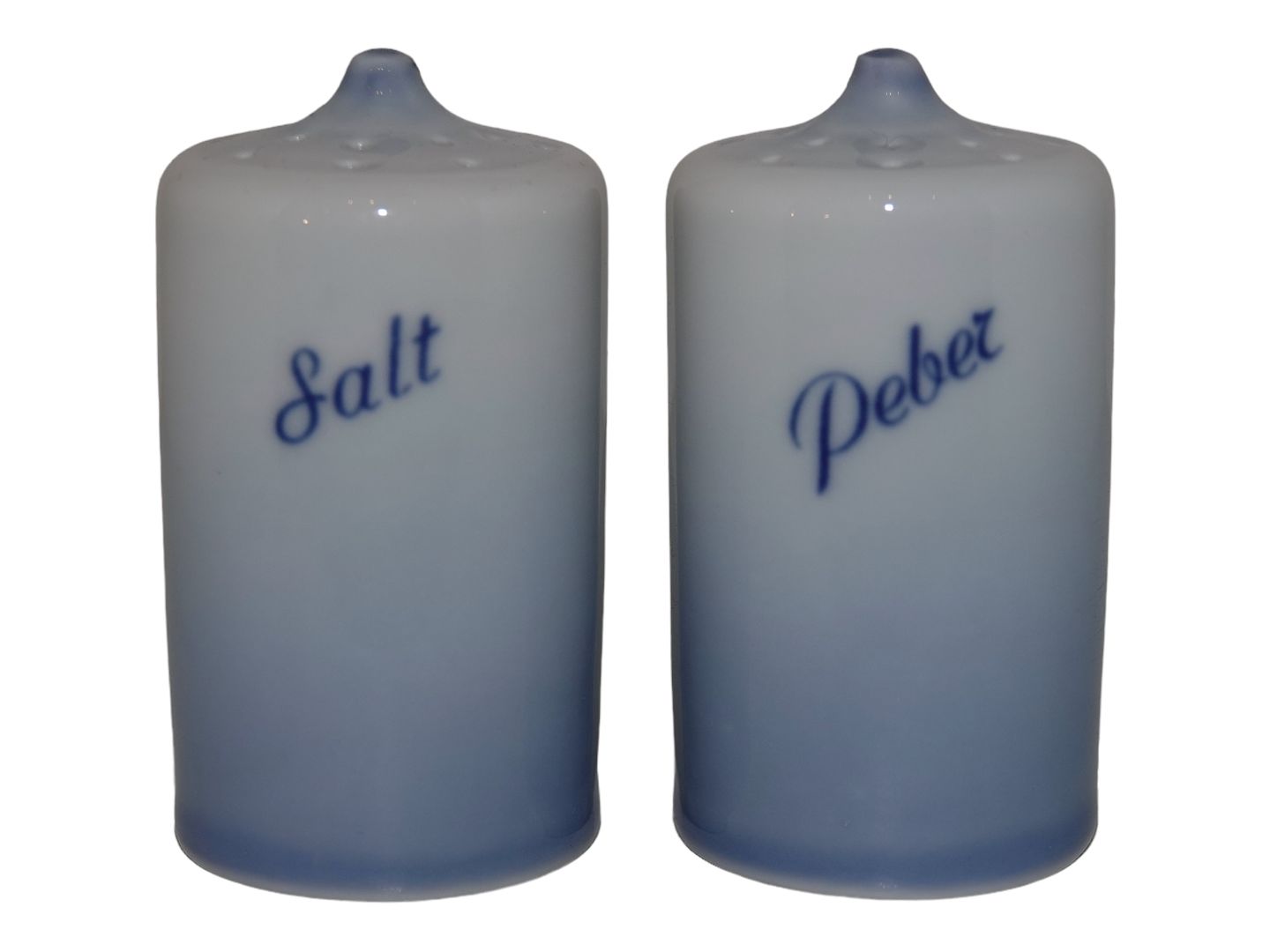 Bing & Grøndahl Blå Tone Jernporcelæn, saltbøsse og peberbøsse med logo. 1. sortering. Højde 7,0 cm. Perfekt stand uden fejl. Prisen er for begge.