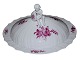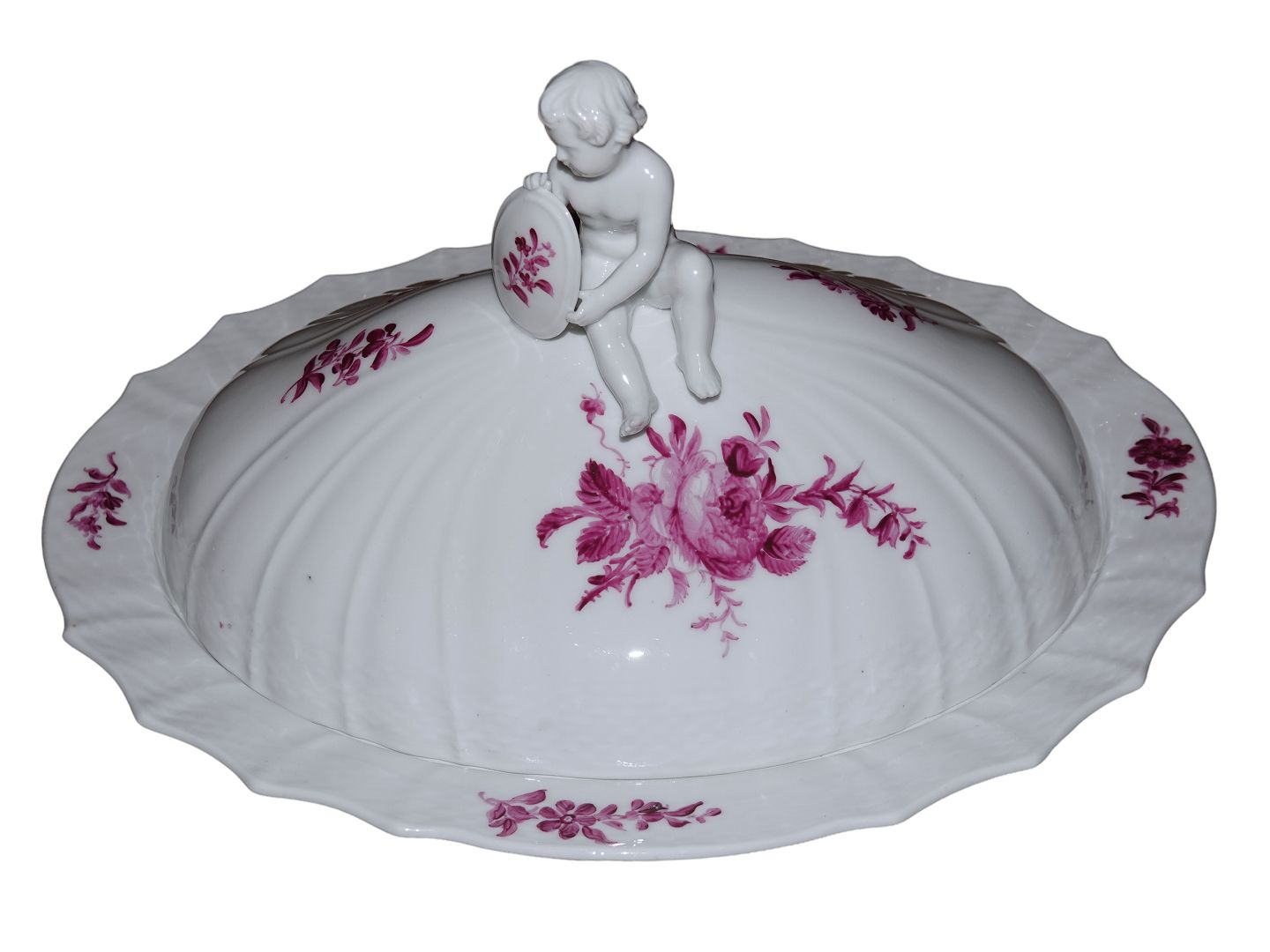 Royal Copenhagen Purpur Blomst Svejfet, stort lågfad med putti figur på toppen. Denne er produceret mellem 1860 og 1893. 1. sortering. Længde 34,9 cm. Perfekt stand uden fejl.