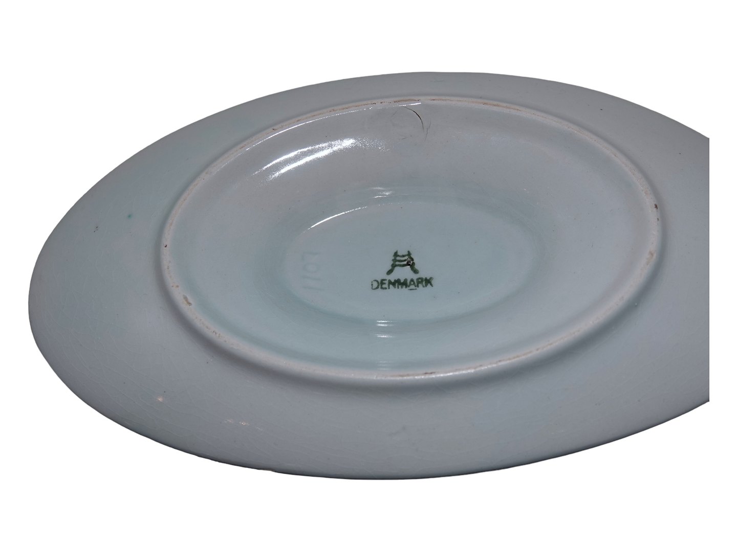 Aluminia Tranquebar, smal sovseskål - gammel model. Dekorationsnummer 11/1107. Længde 20,5 cm. 1. sortering. Der er lidt malerfejl inde i skålen, se billede nr. 2, ellers perfekt stand.