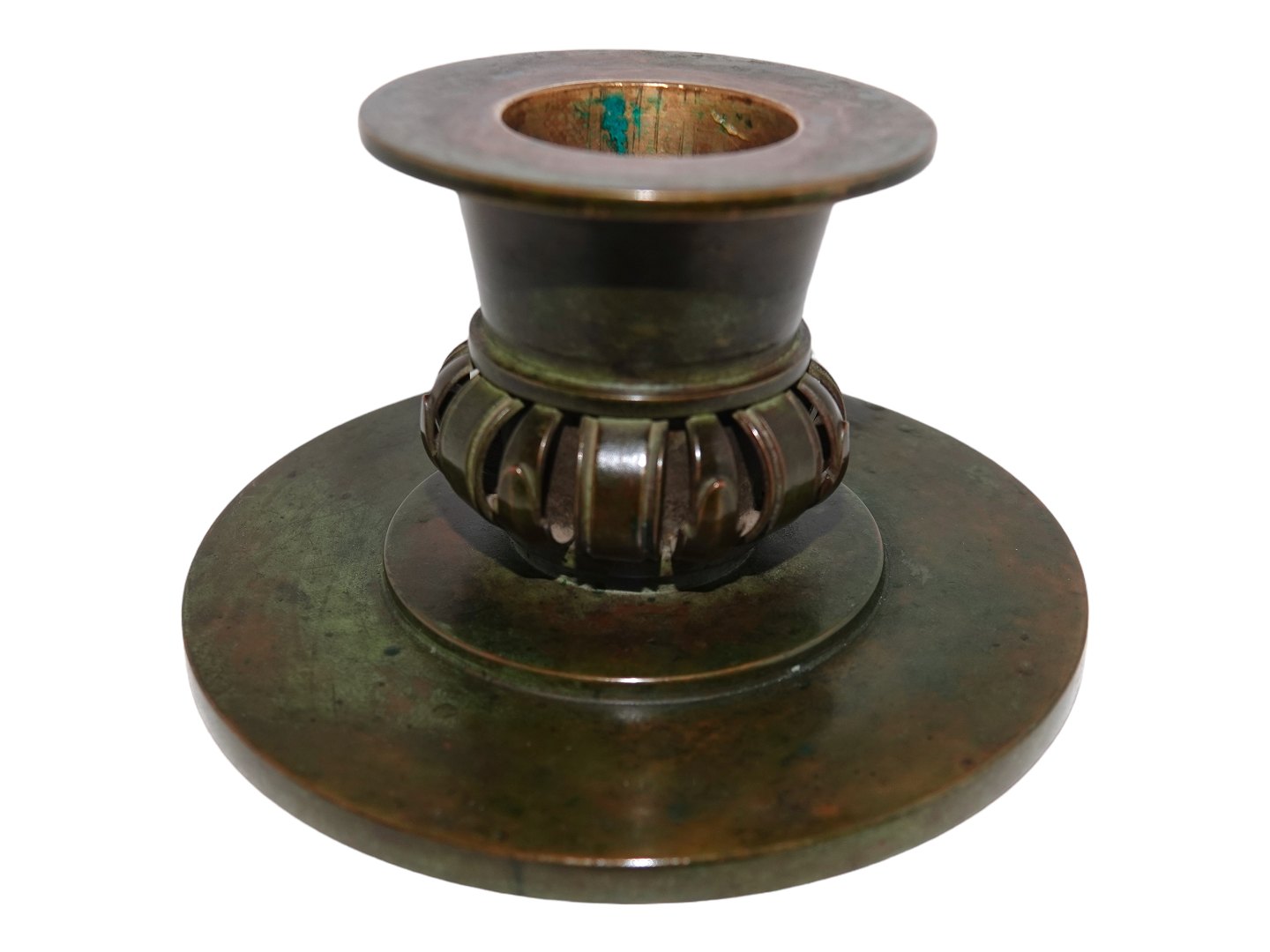 Pair of large low candle light holders in bronze from around 1920 to 1930. Diameter 13.3 cm., height 7.0 cm. There is patina but they are in excellent condition.