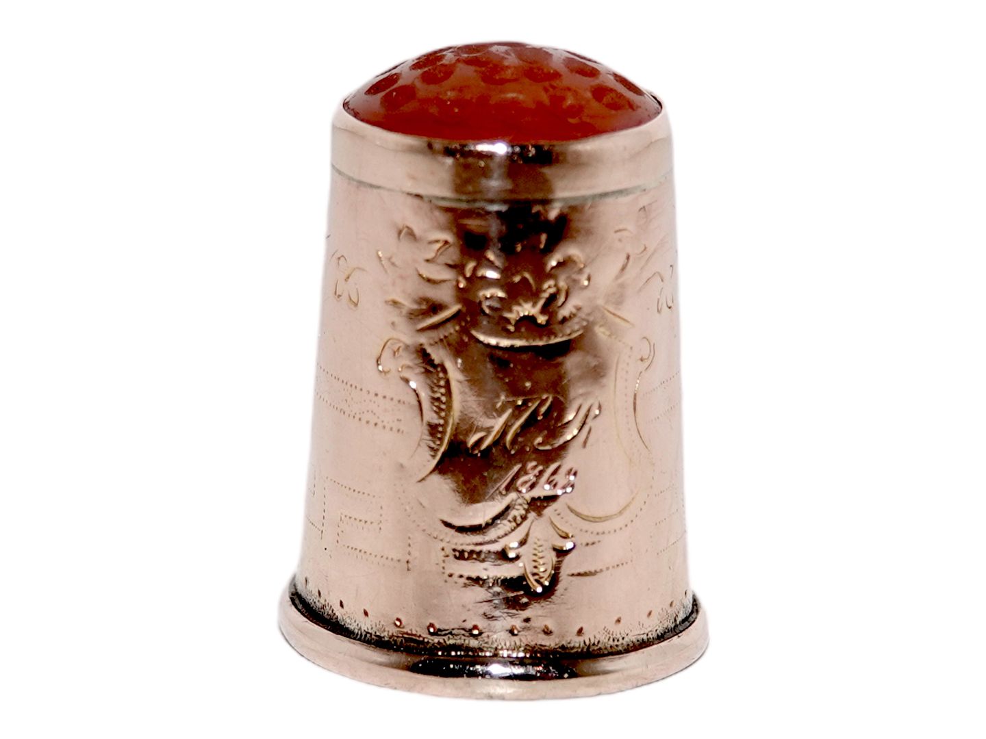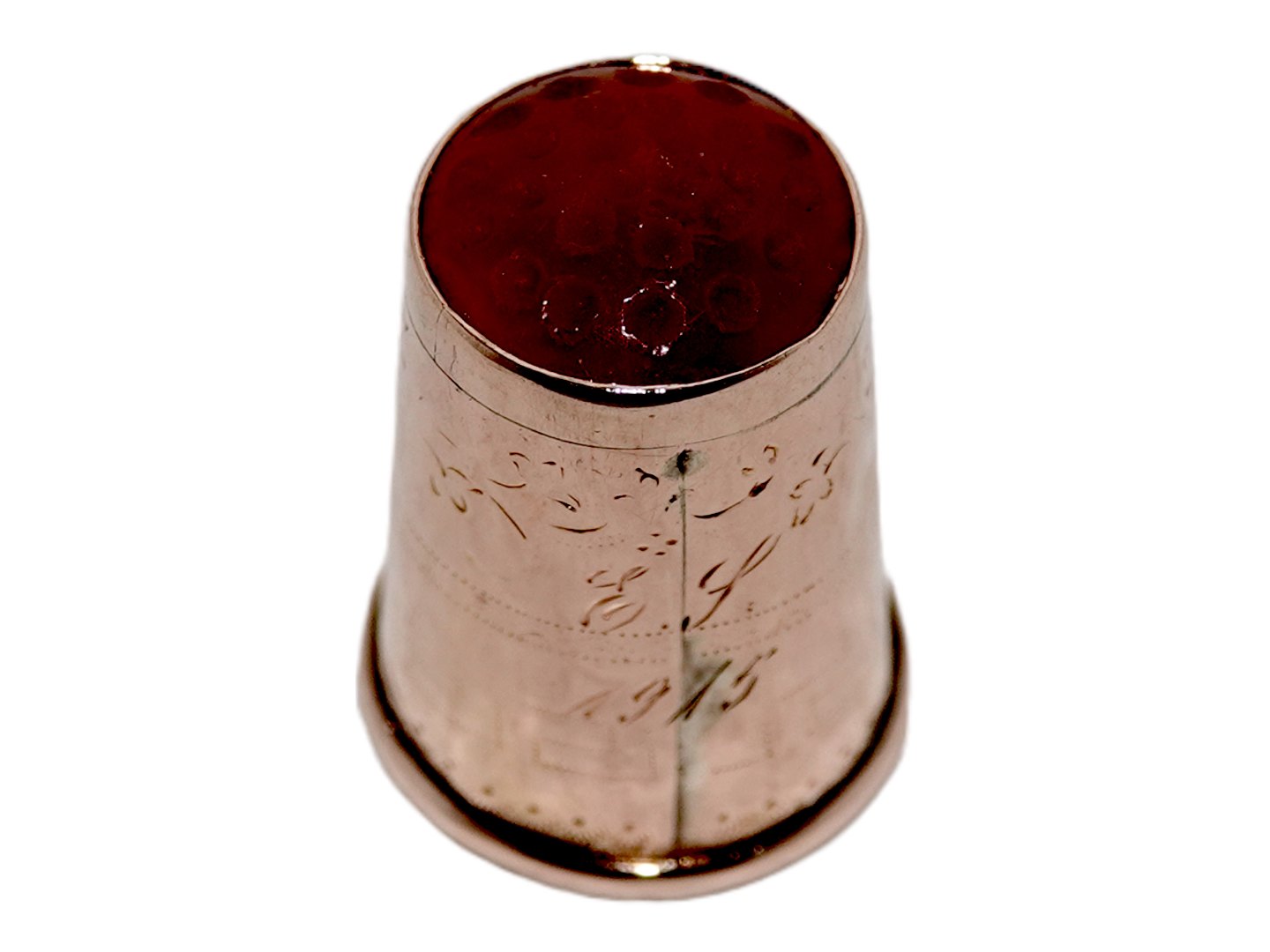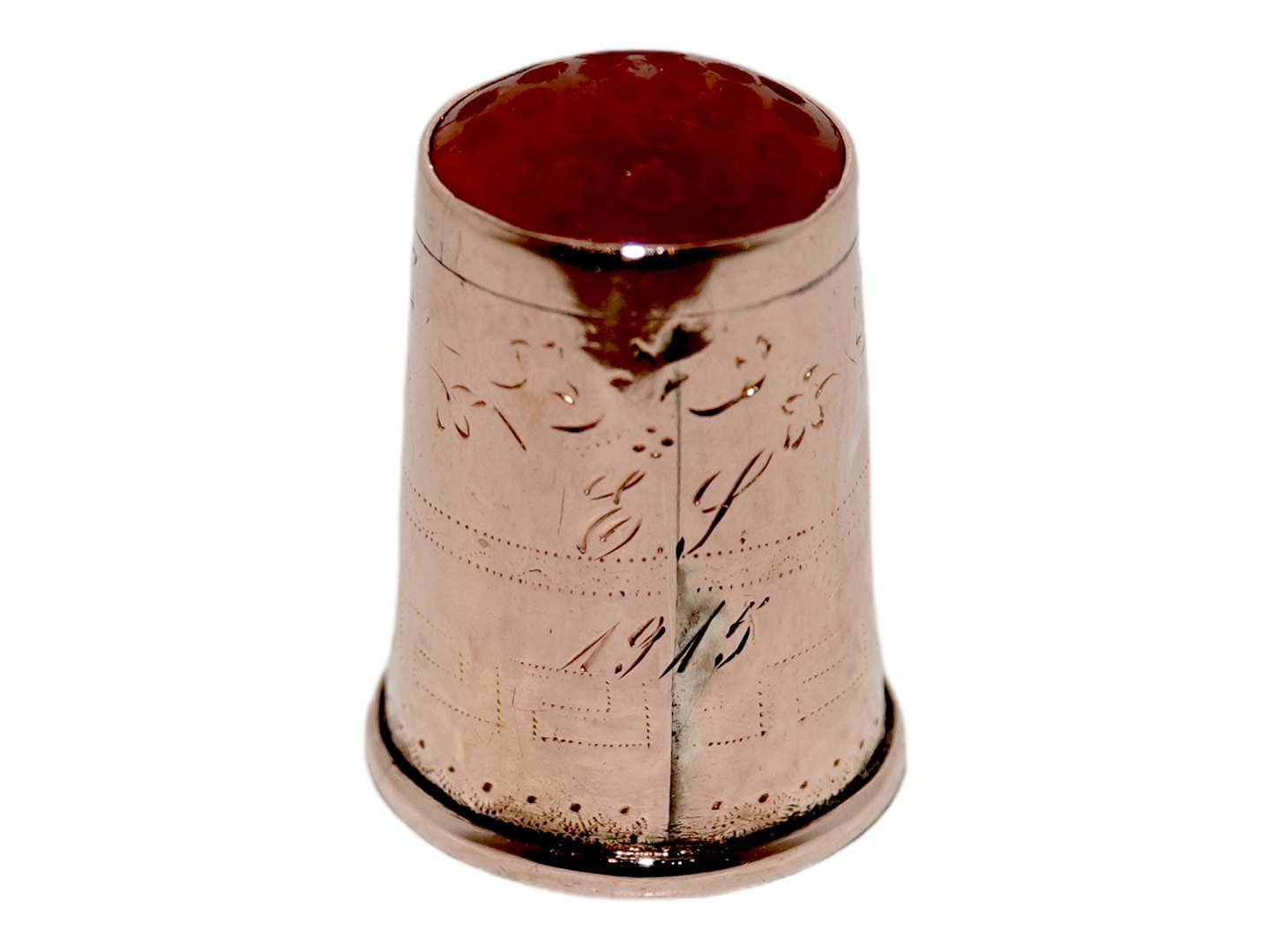 Fingerbøl i 14 karat guld. Stemplet "585". Højde 2,0 cm. Har hyggelig gammel indgravering med et årstallet 1915 på den ene side og 1864 på den anden side. Fin stand.