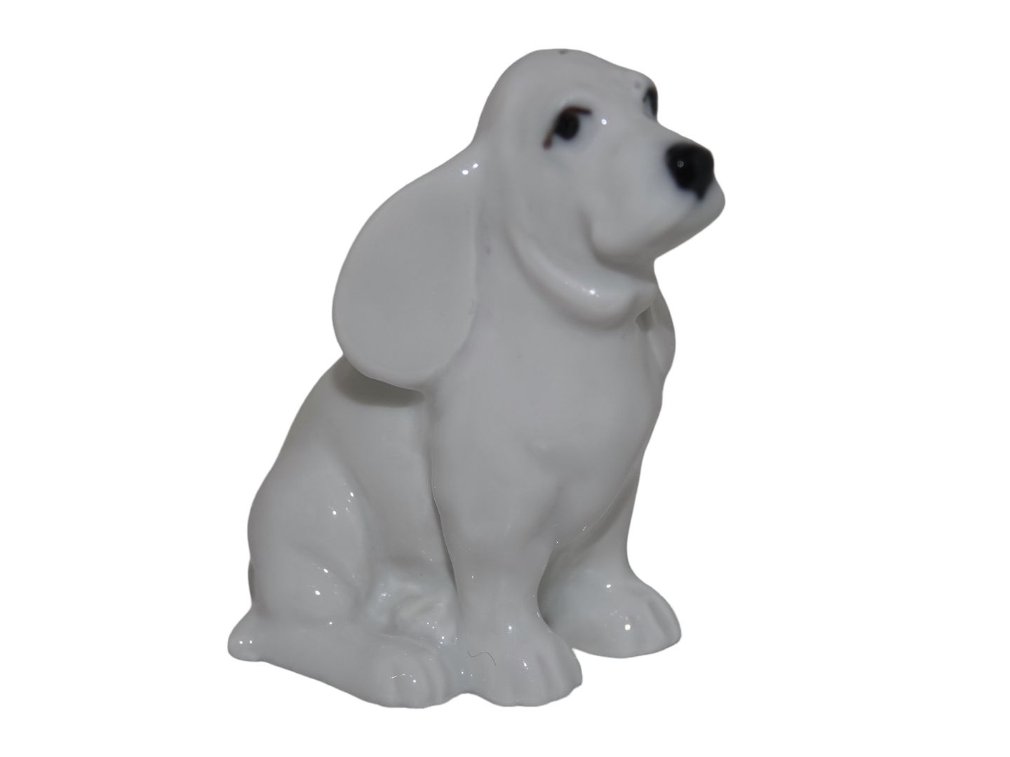 Miniature Royal Copenhagen hundefigur, hvid spaniel. Dekorationsnummer 7/2549. 2. sortering pga. en plet i glasuren i toppen, se næstsidste foto. Højde 5,5 cm. Perfekt stand uden fejl.