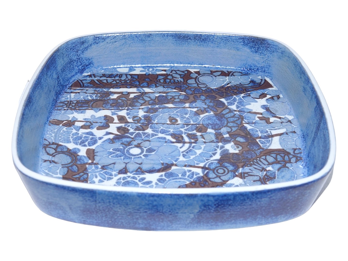 Royal Copenhagen Faience Baca, large blue dish. Designed (and signed) by artist Berte Jessen. Decoration number 780/2885. Factory first. Measures 26.6 by 26.6 cm. Perfect condition with no chips, cracks or repairs.