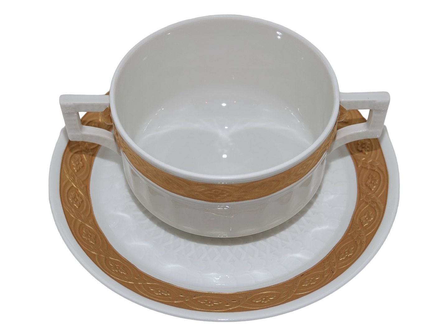 Royal Copenhagen Guld Vifte, stor bouillionkop med tilhørende underkop. Dekorationsnummer 414/11565. 1. sortering. Diameter på koppen er 10,0 cm. Perfekt stand uden fejl.
