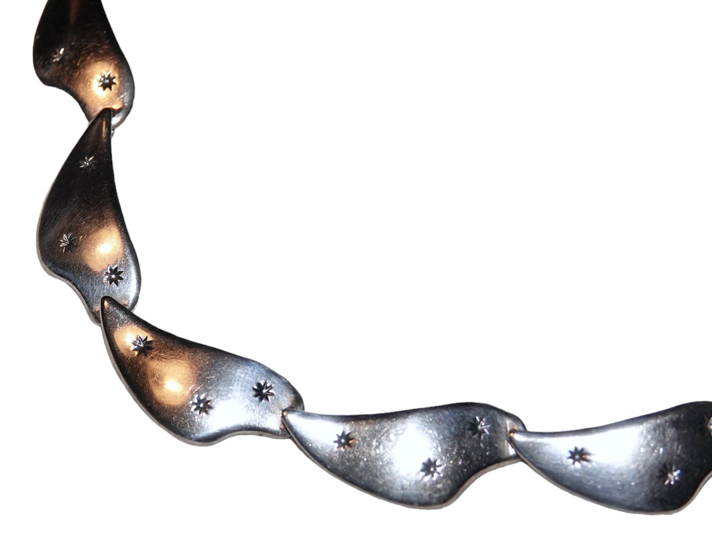 Modern Danish sterling silver, necklace with stars from around 1949 to 1960. Hallmarked "830S A&K". Aarre & Krogs Eftf. was a silversmith in Randers from 1949 until 1990. Length 38.0 cm. Excellent condition.
