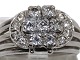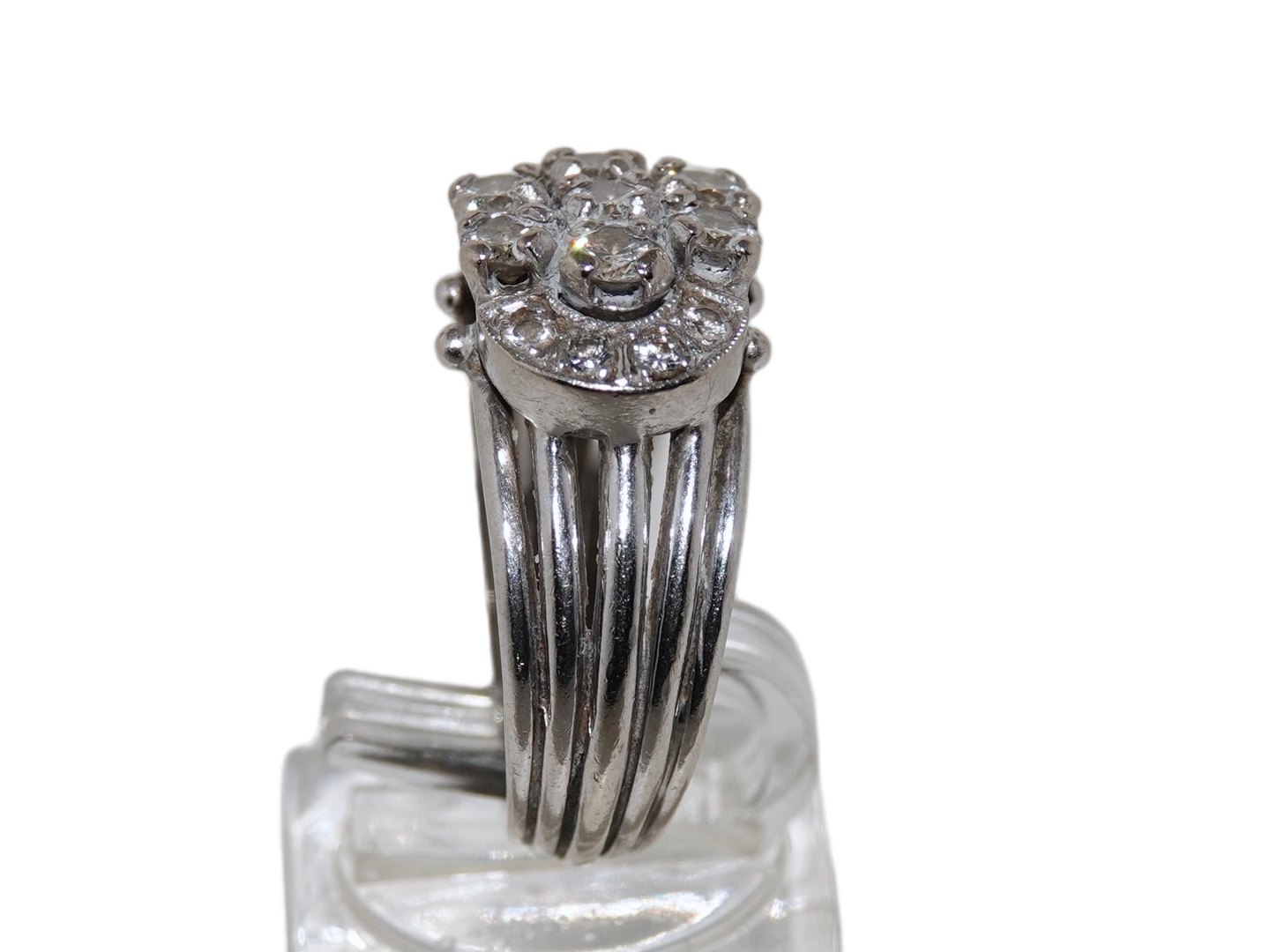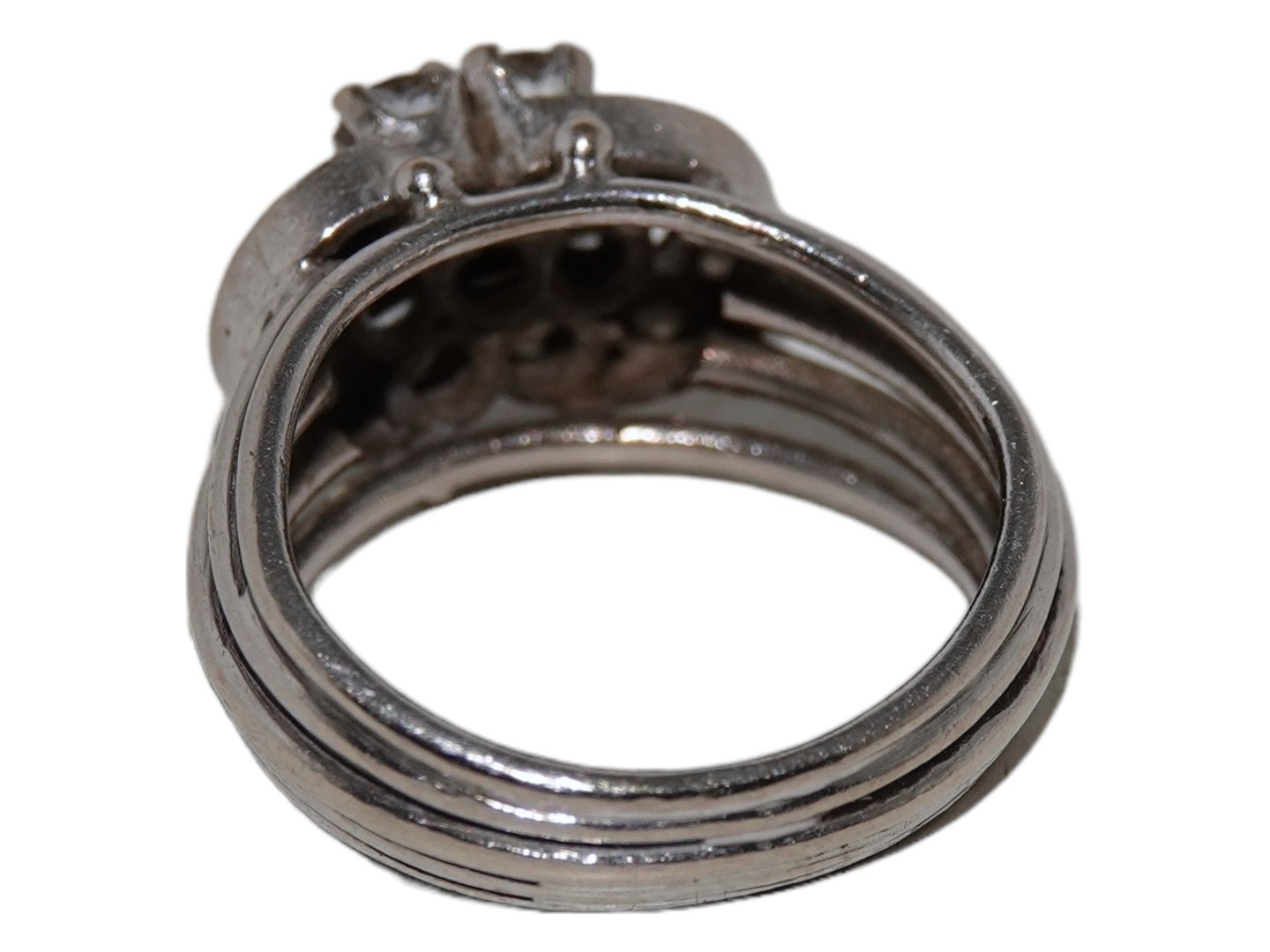 14 carat white gold ring with seven (7) large and many small diamonds.
