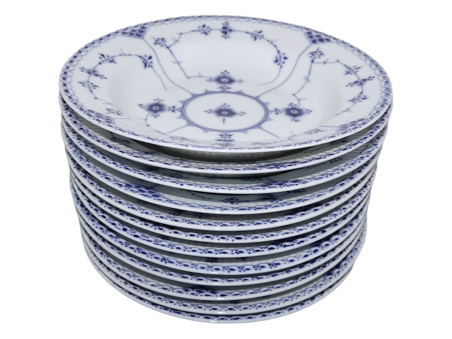 Royal Copenhagen Blue Fluted Half Lace, large soup plate. Decoration number 1/565. Factory second. Diameter 24.8 cm. Perfect condition with no chips, cracks or repairs.