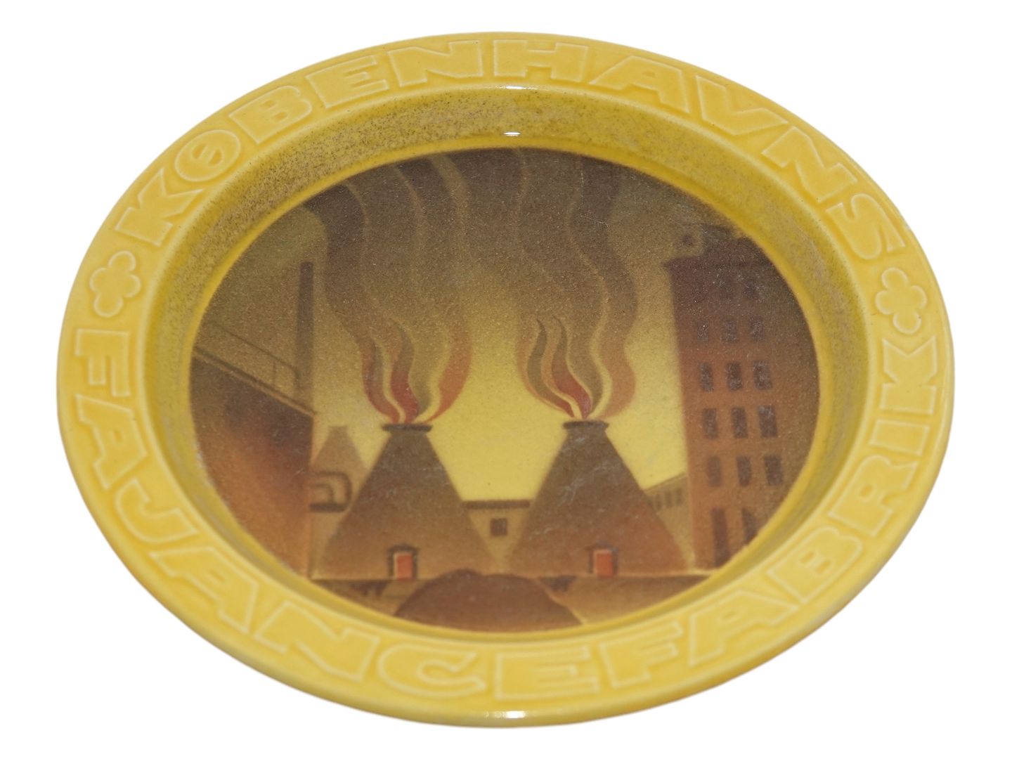 Aluminia small yellow dealer plate decorated with the Aluminia factory and the text: KØBENHAVNS FAJANCEFABRIK.