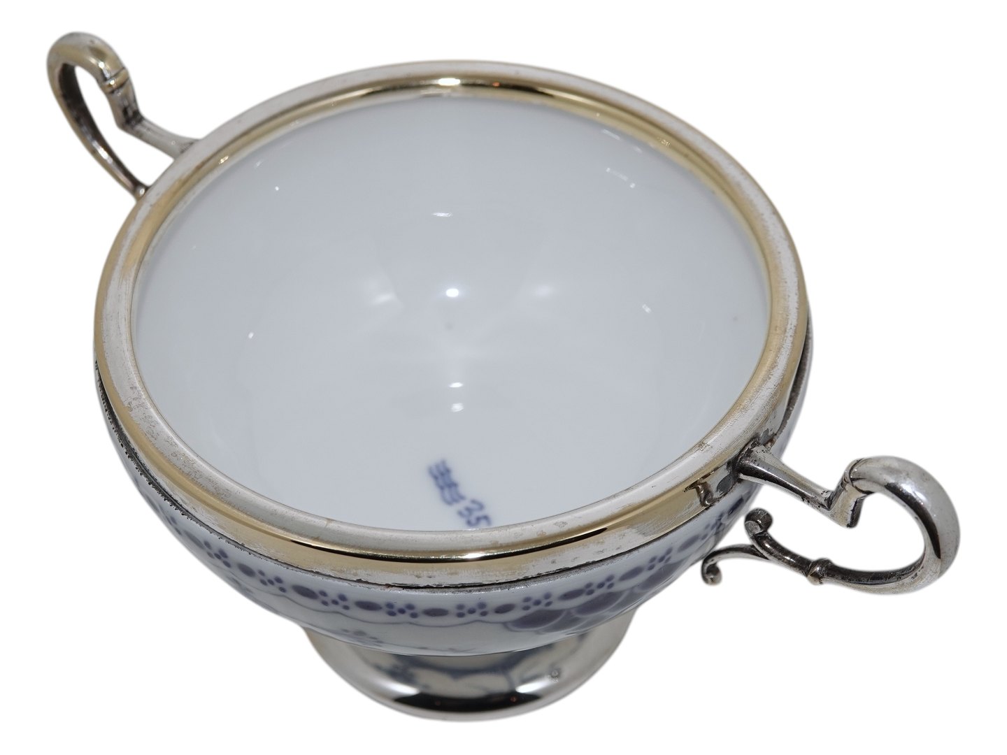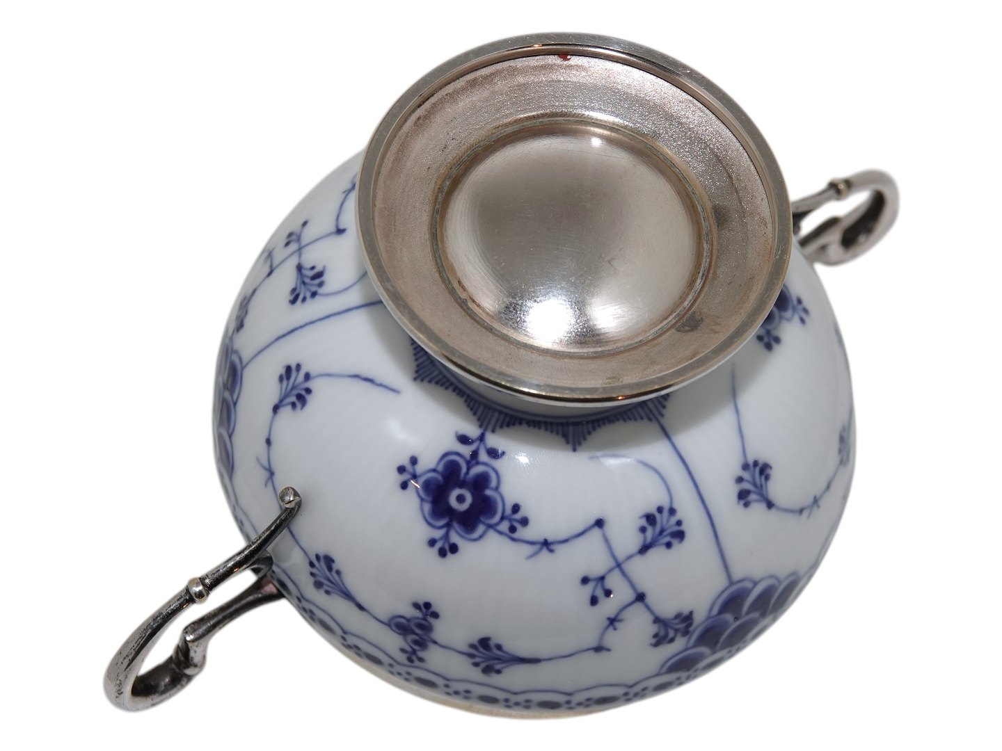 Royal Copenhagen Blue Fluted Half Lace, sugar bowl with silver plate stand and handles.