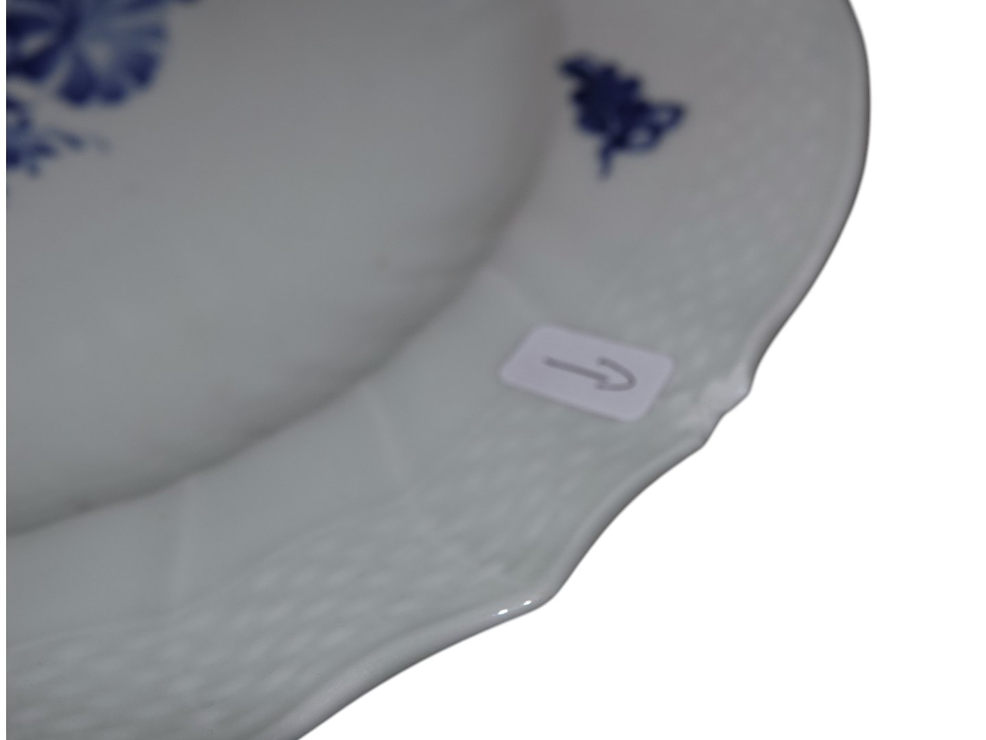 Royal Copenhagen Blå Blomst Svejfet, tidlig middagstallerken der er grålig i porcelænet.