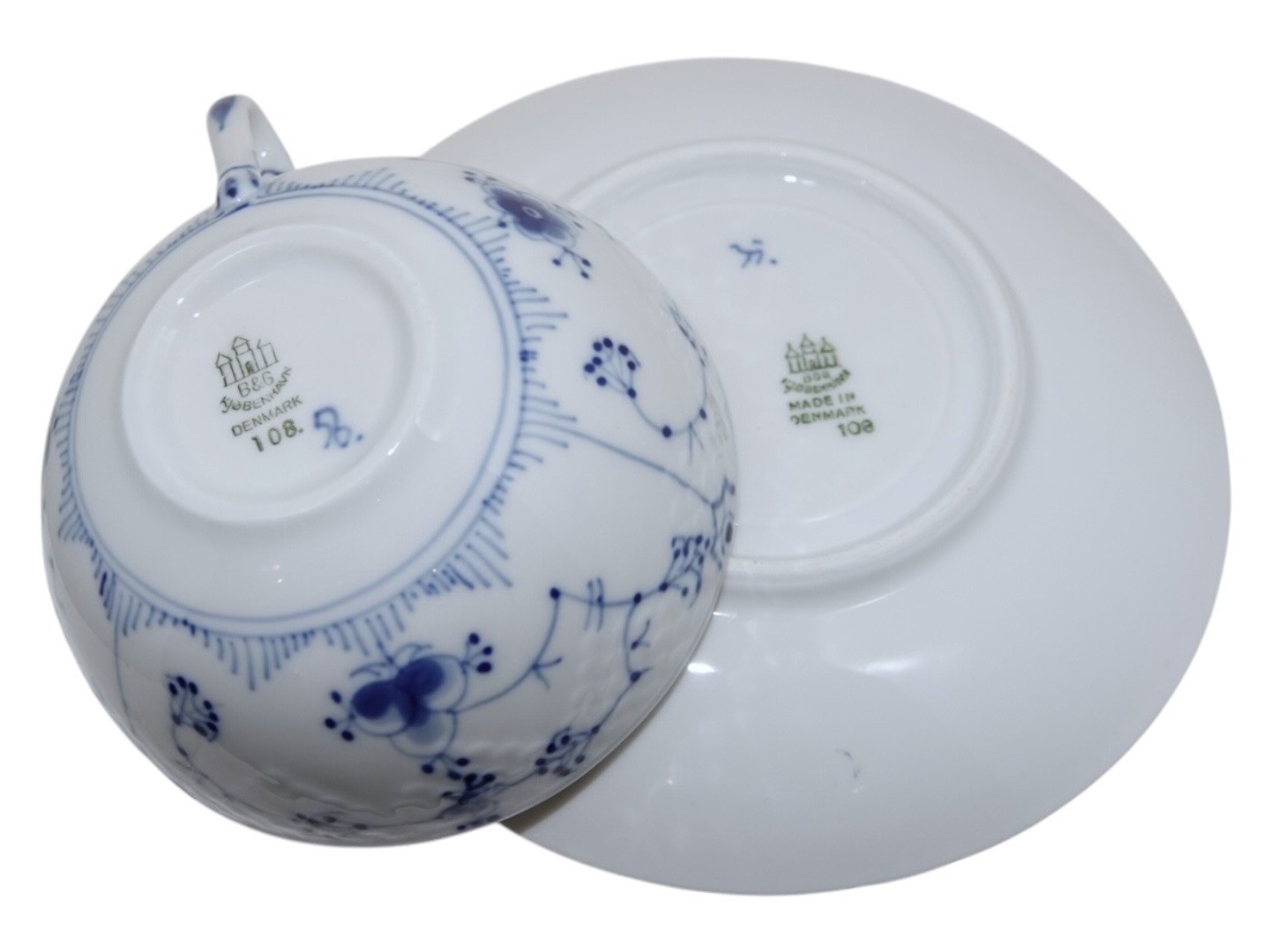Bing & Grondahl Blue Traditional, (Blue Fluted), teacup with matching saucer. Decoration number 108. The cups measure 10.0 cm. in diameter. Perfect condition with no chips, cracks or repairs.