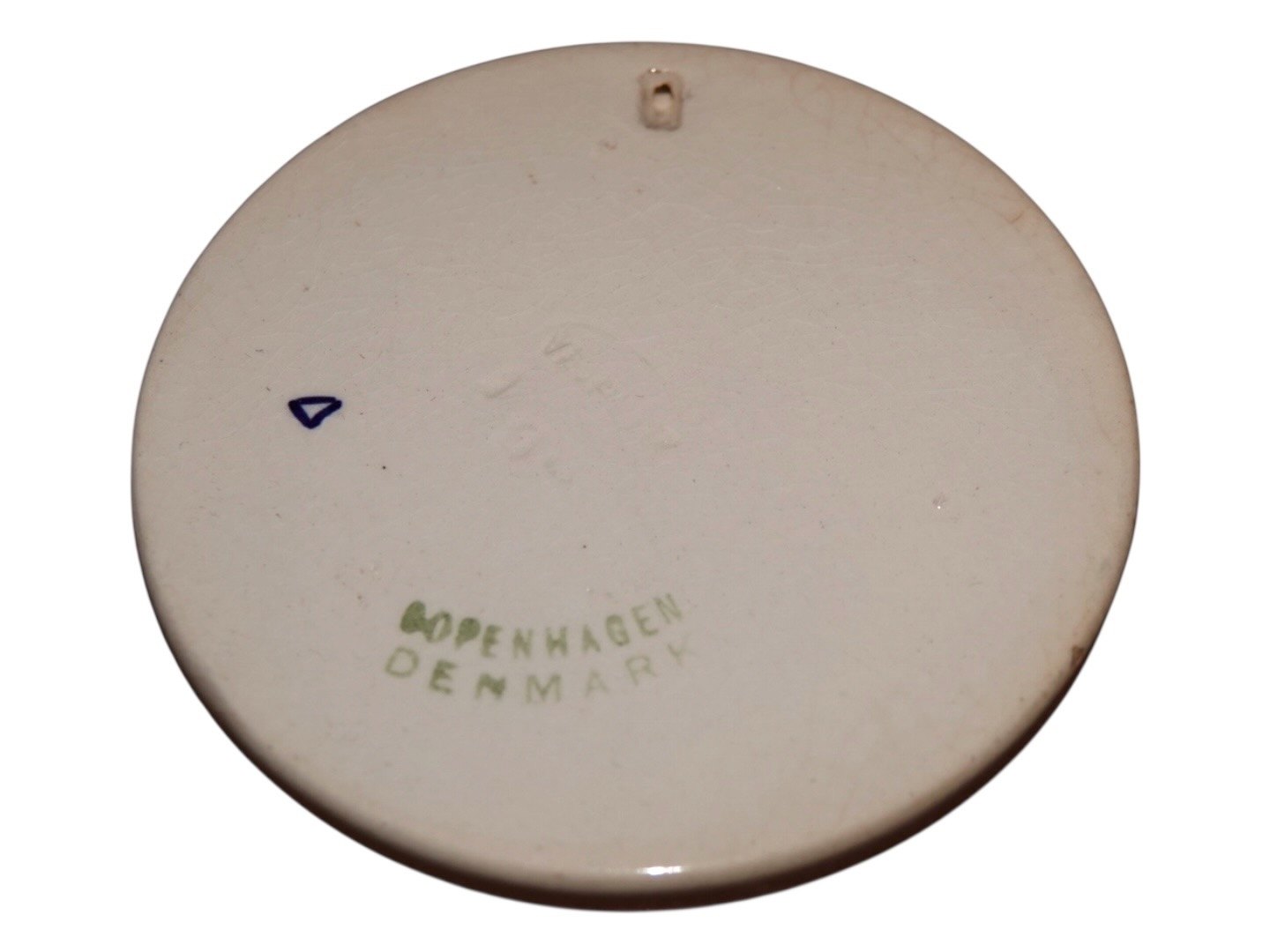 Aluminia Child Welfare Plate from 1915 with a girl. Diameter 9.0 cm. There is a small glaze chip on the frontside and discolorations and crazings in the glaze, otherwise perfect condition.