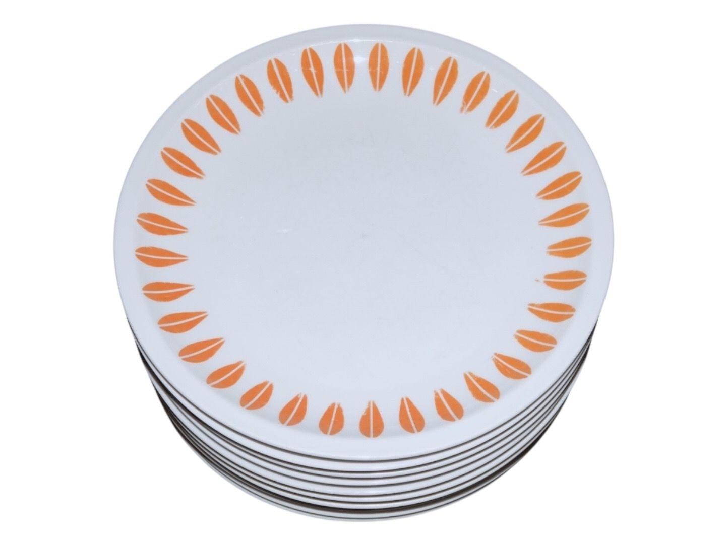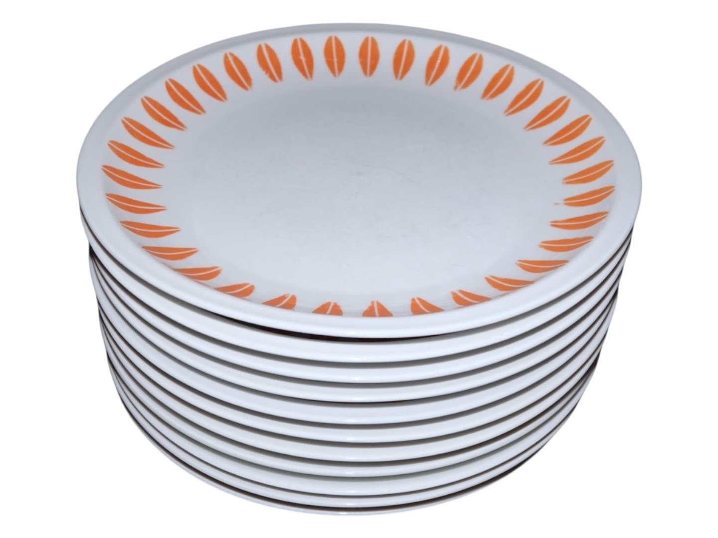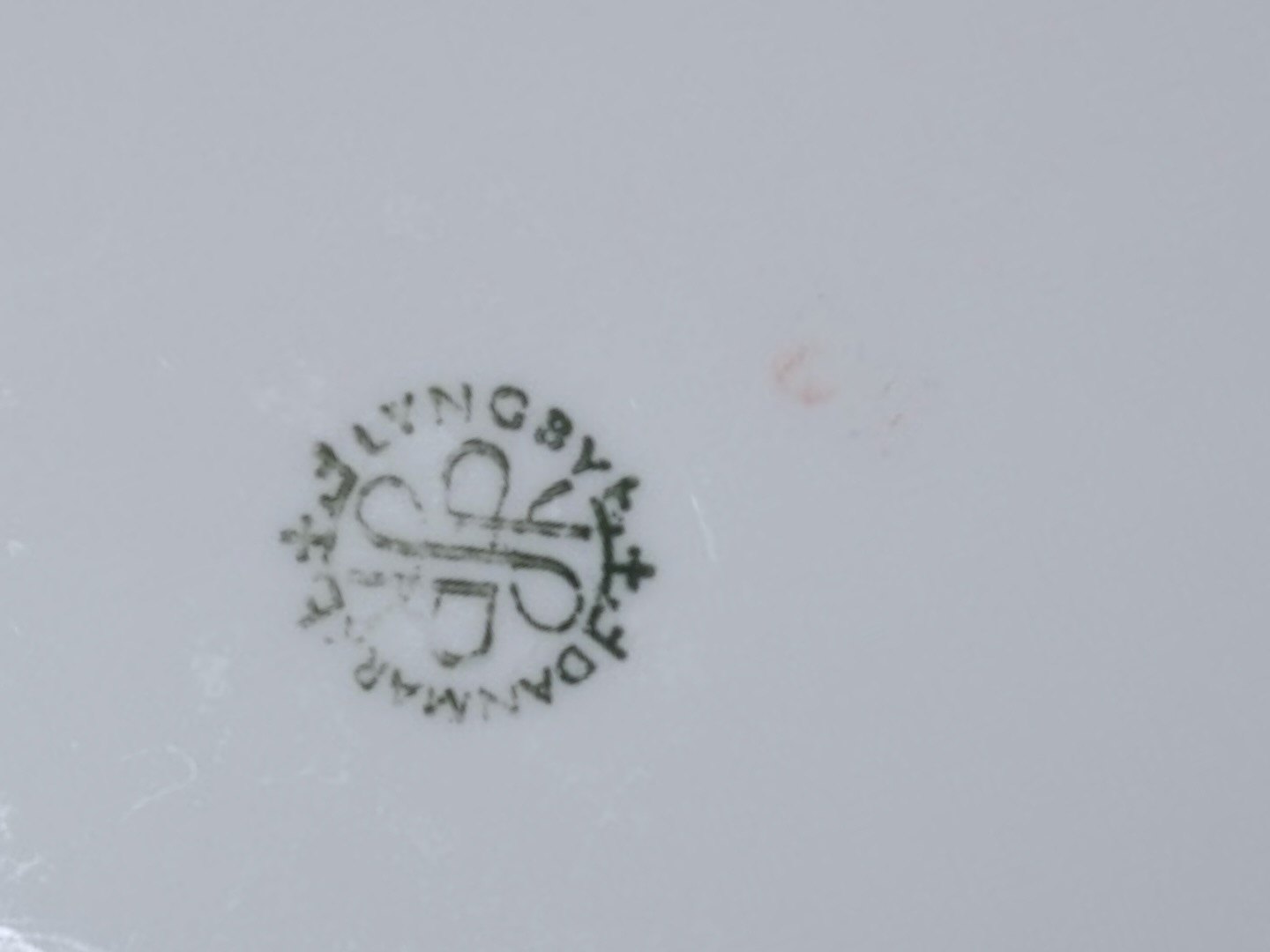 Lyngby Lotus, middagstallerken med orange dekoration. Diameter 24.0 cm. Der er slid og/eller misfarvninger i glasuren - ellers fejlfrie.