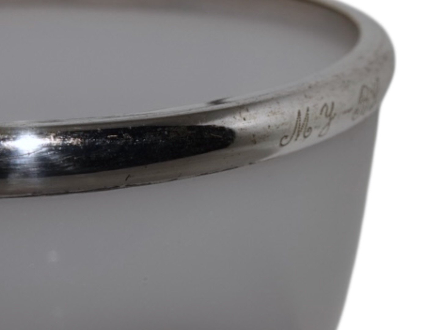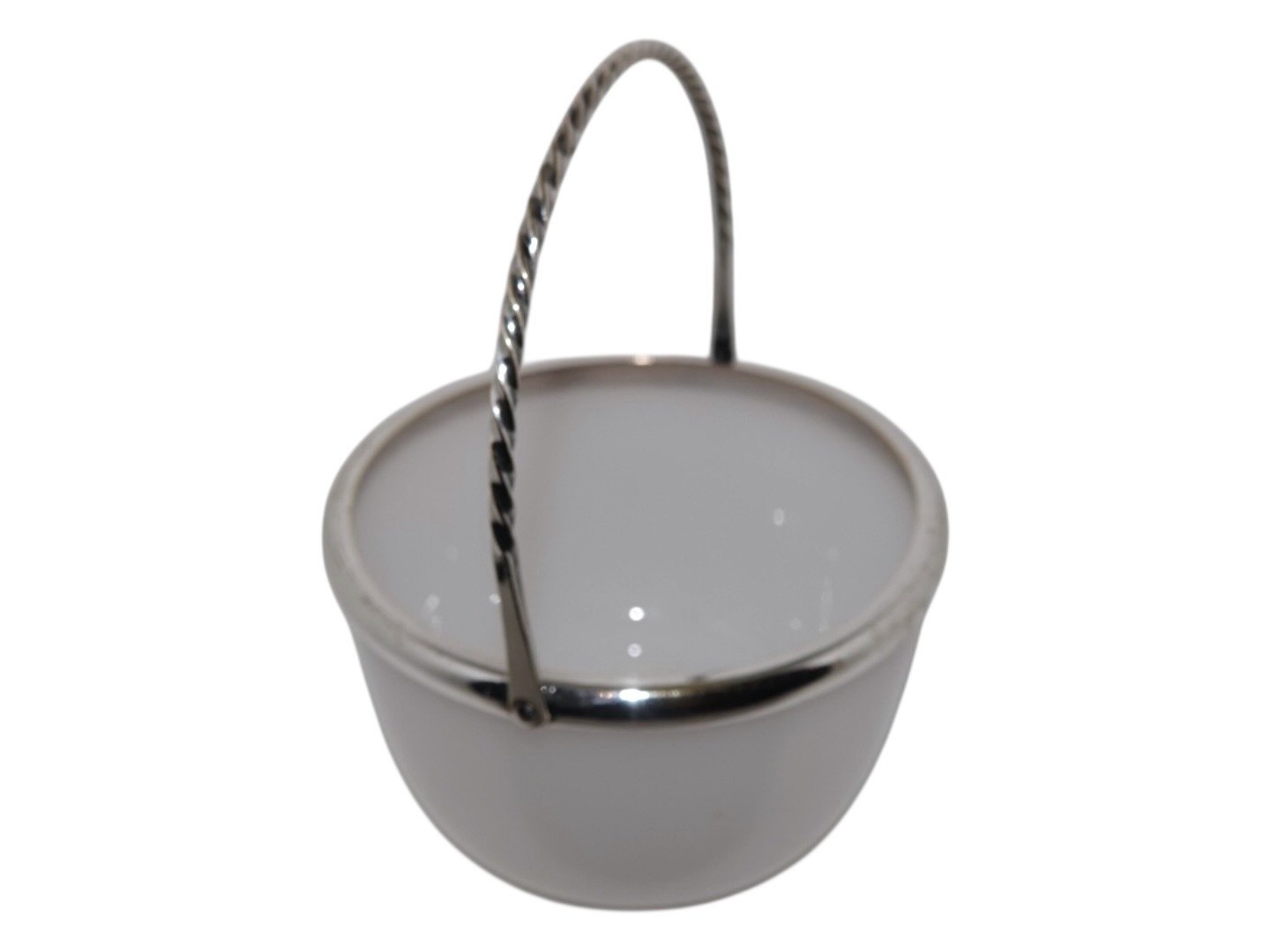 White opaline glass sugar bowl with silverplate handle from the 19th century. Diameter 12.0 cm., height 8.0 cm. There is an old inscription in the handle, please see the picture. Excellent condition.