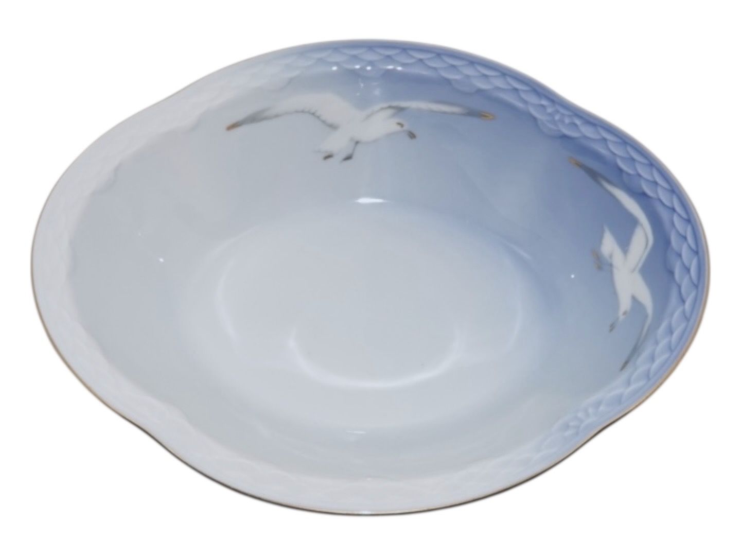 Bing & Grøndahl Måge med guldkant, lille oval skål. Af fabriksmærket kan det udledes, at denne er produceret mellem 1962 og 1970l Dekorationsnummer 12A. 1. sortering. Længde 22,0 cm. Perfekt stand uden fejl.