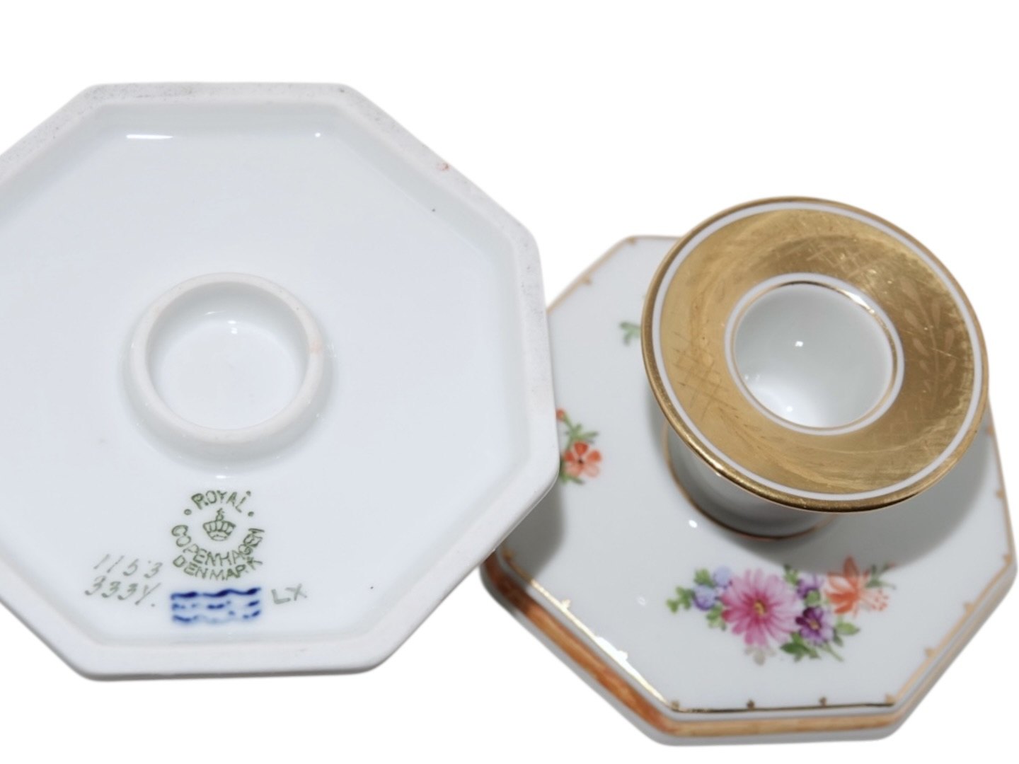 Royal Copenhagen Variation af Guldkurv, lysestage med blomster. Dekorationsnummer 1153/3334. Den ene er produceret i 1939 og den anden i 1940. 1. sortering. Diameter 9,7 cm. Perfekt stand uden fejl.