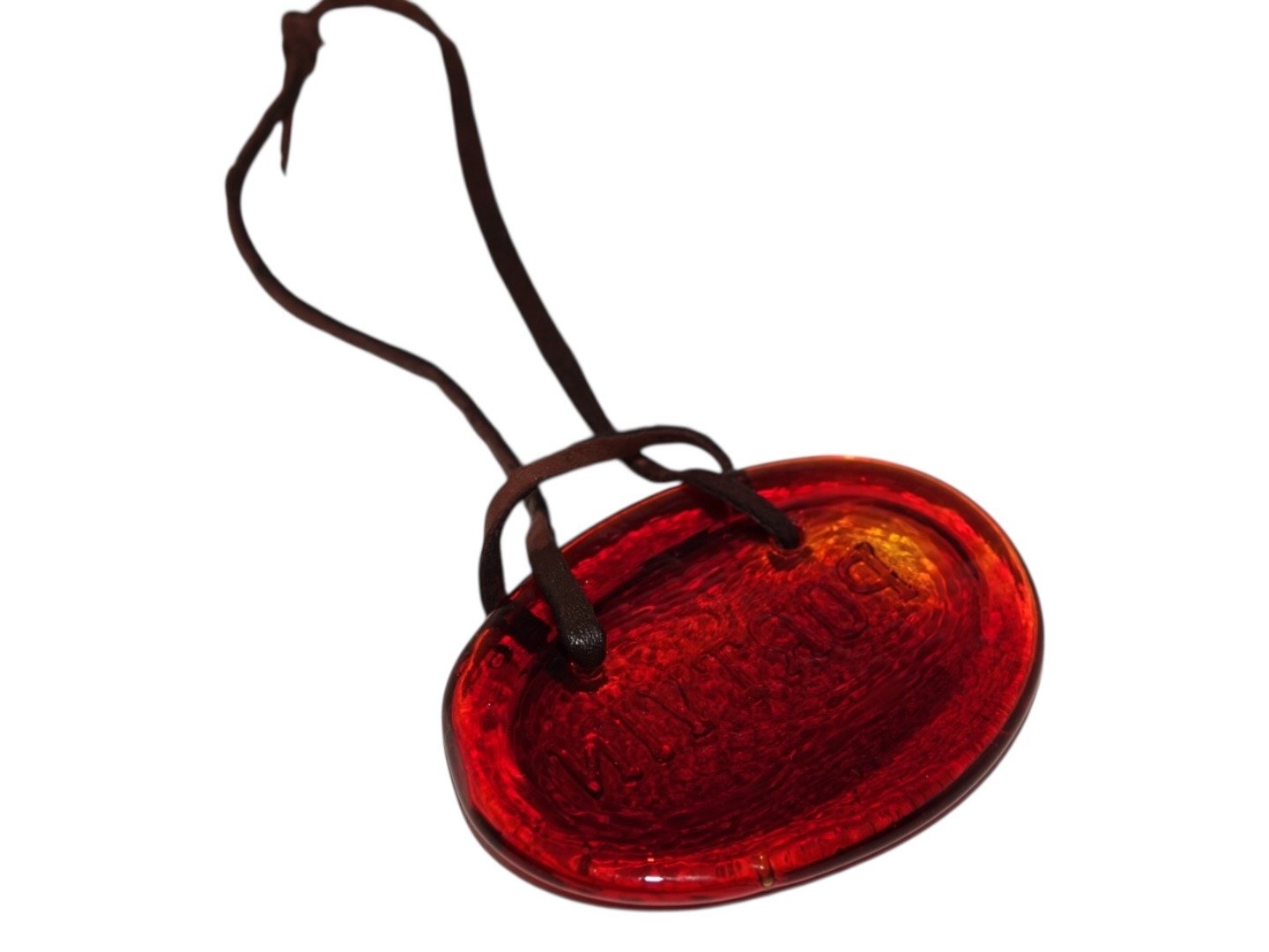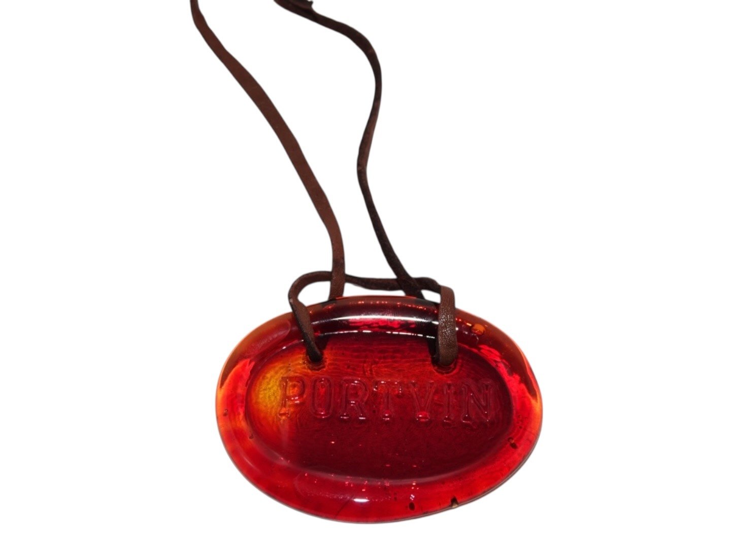 Holmegaard stort PORTVIN skilt i orangerødt glas fra 1970'erne. Måler 7,0 x 5,3 cm. Perfekt stand.