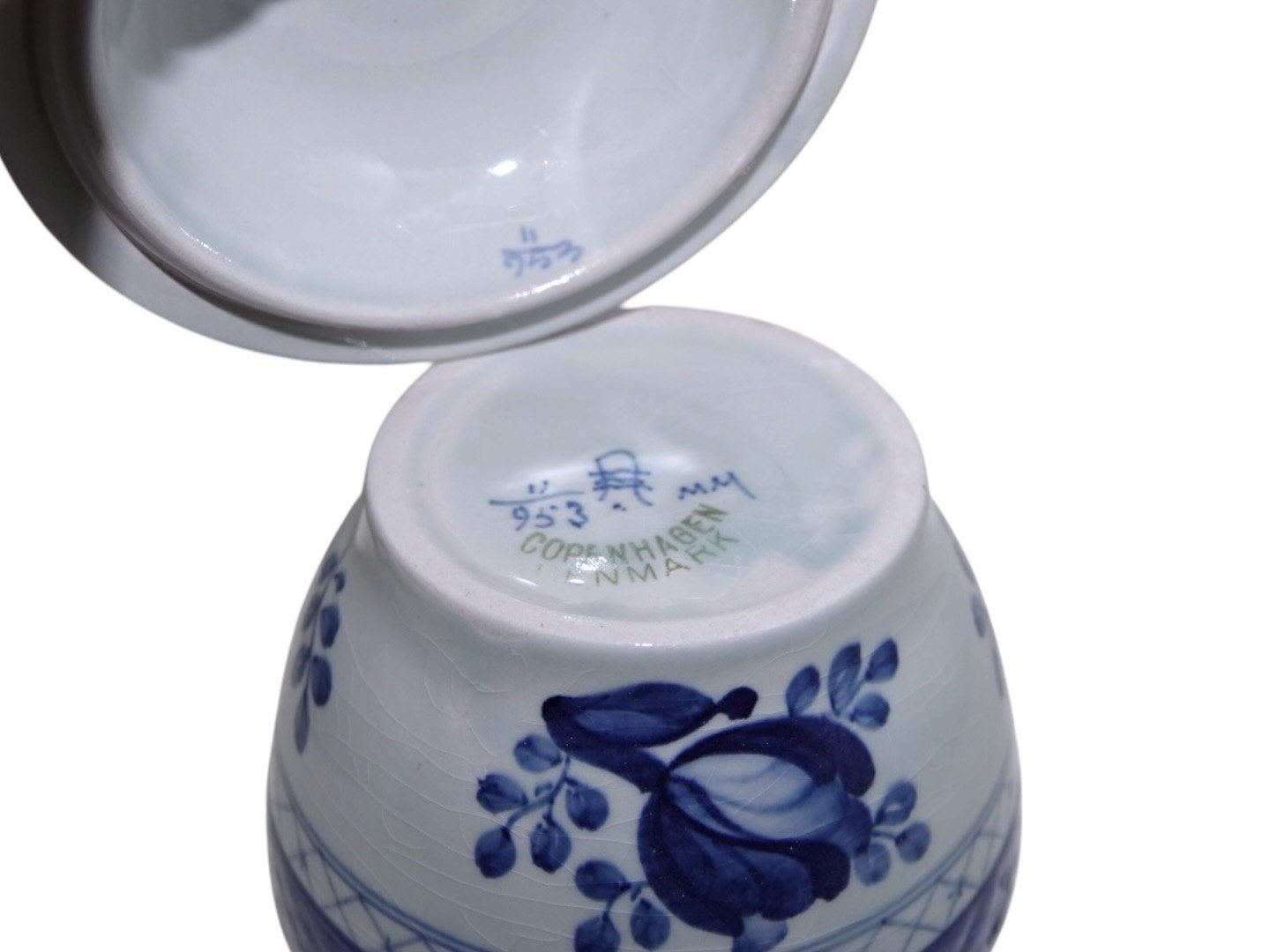 Aluminia Tranquebar, sjælden set marmeladekrukke. Dekorationsnummer 11/953. 1. sortering. Diameter 10,0 cm. Der er svage krakkeleringer i glasuren ellers perfekt stand uden fejl.