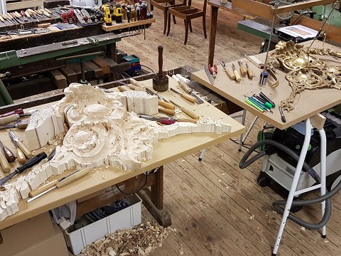 Ny top og ben skæres og forgyldes på Ortmann Chatol, ca. 1740.