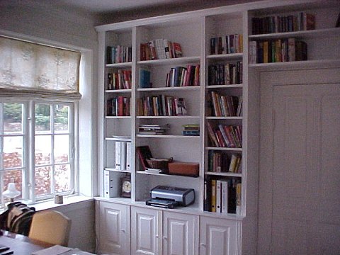 Her er et eksempel på et renoveret reolsystem med indbygget TV-arm.