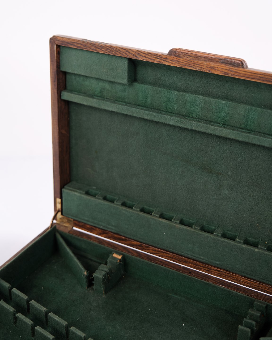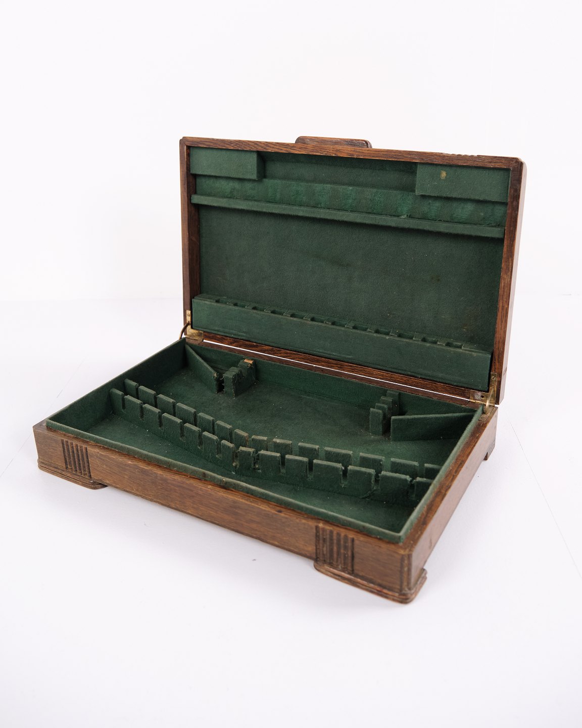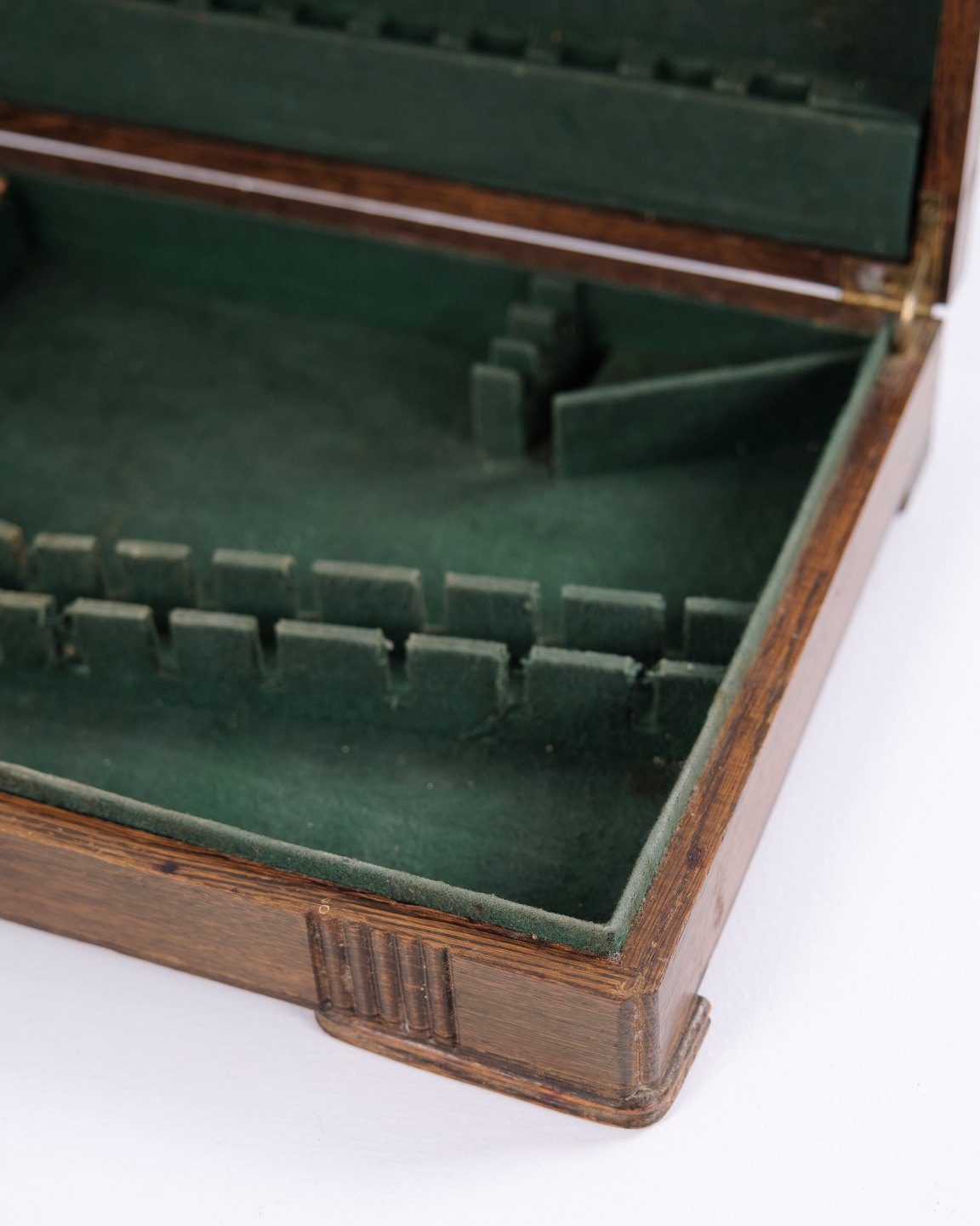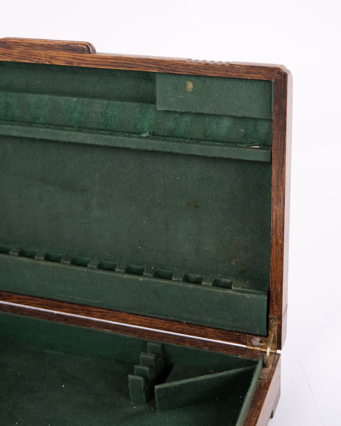 Antik bestikkasse i egetræ med grøn indmad og messingbeslag. Klassisk opbevaringskasse til bestik, sølv og småting. Solidt håndværk.