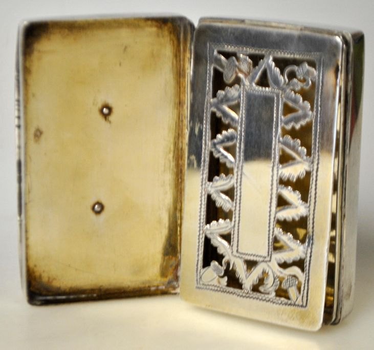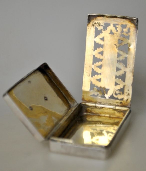 Carl Christopher Rode (1826 - 1902) Åbenrå, Danmark: Lugtedåse i sølv. Stemplet med mestermærke og byvåben. Indvendig lueforgyldt og gitter med agern og egeløv. 7,5 x 4,5 x 1,5 cm. Vægt: 68 gram.
